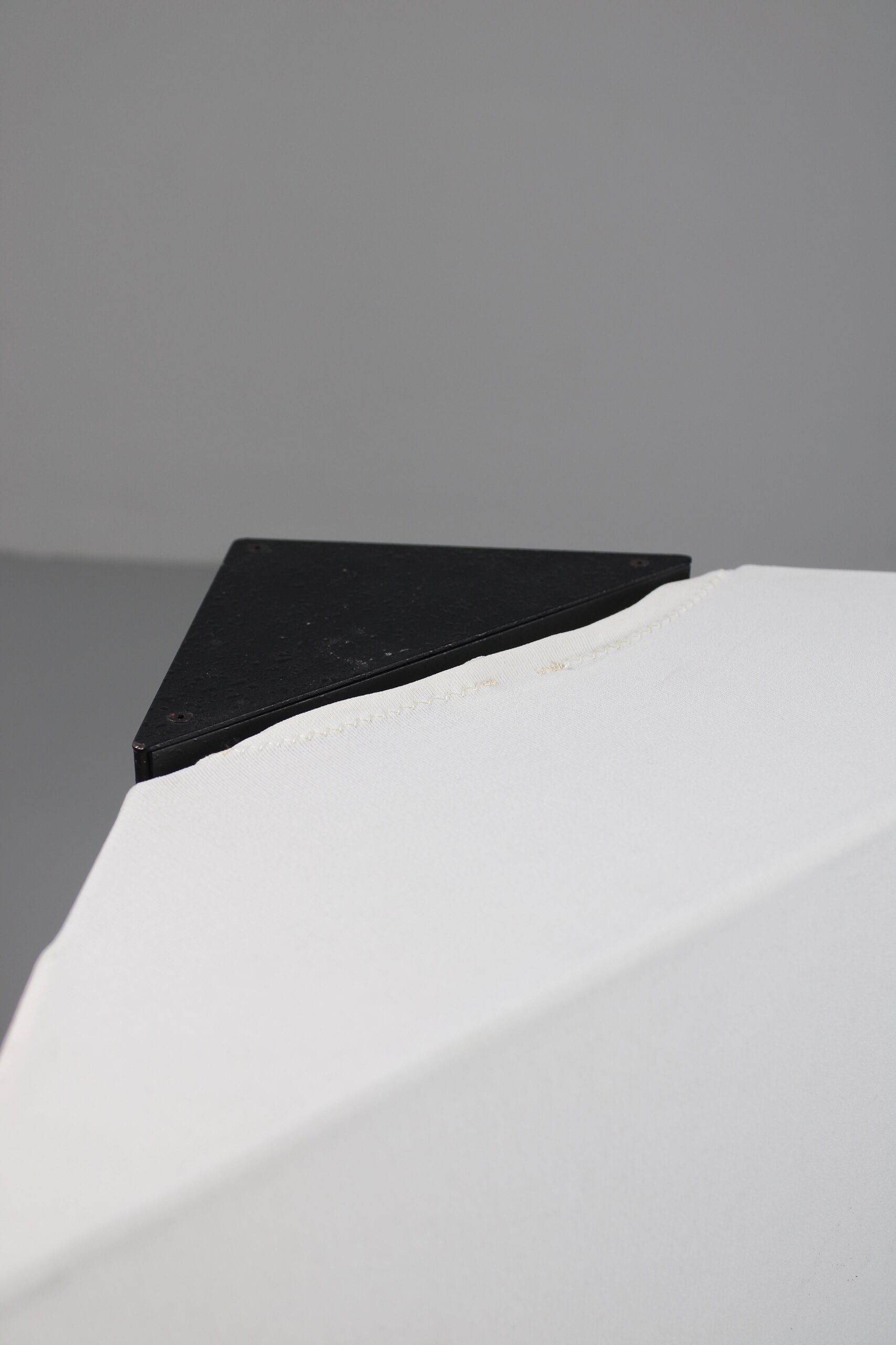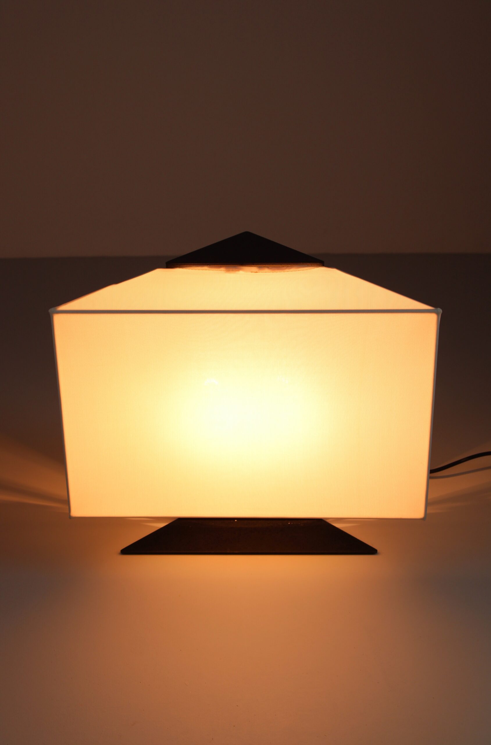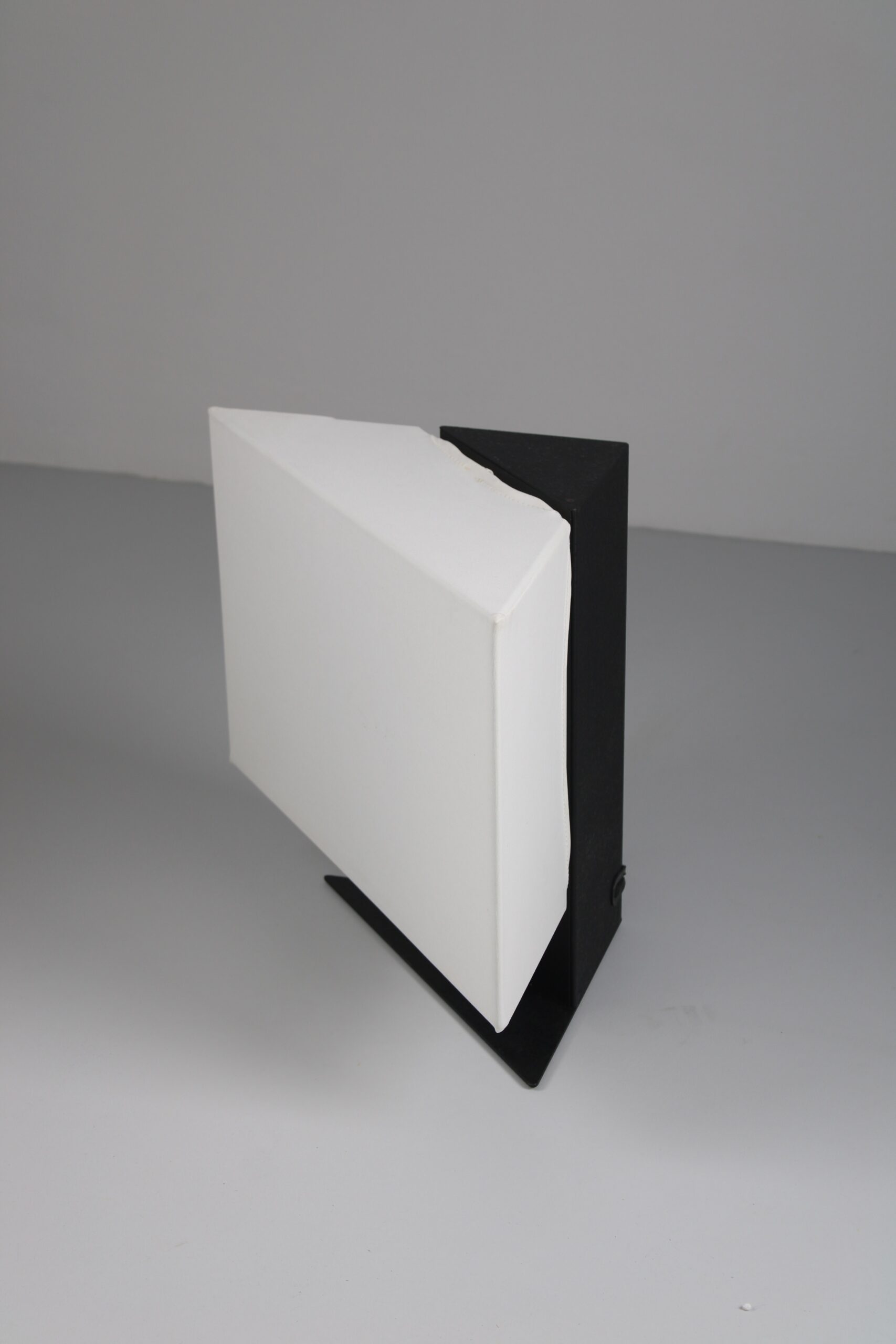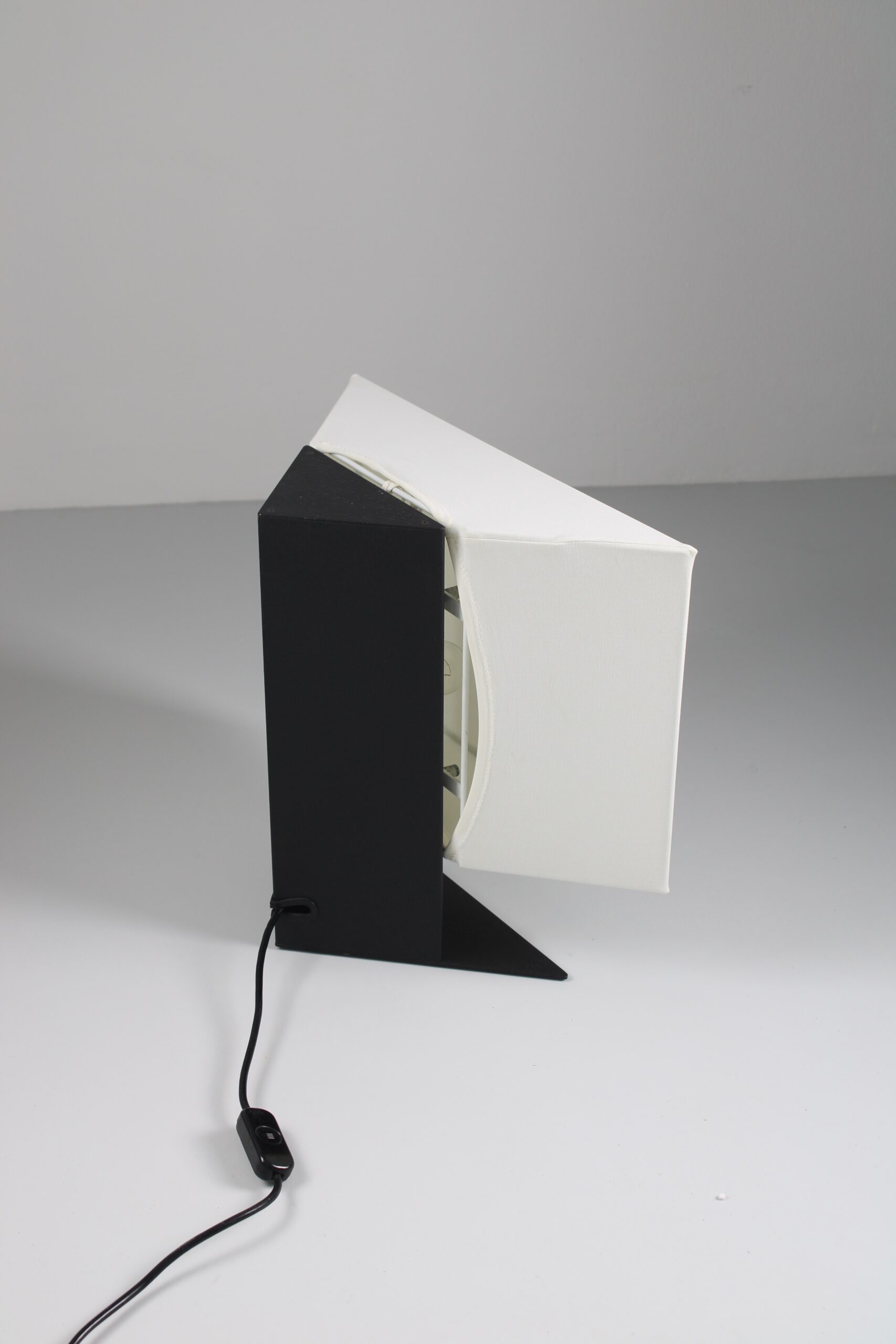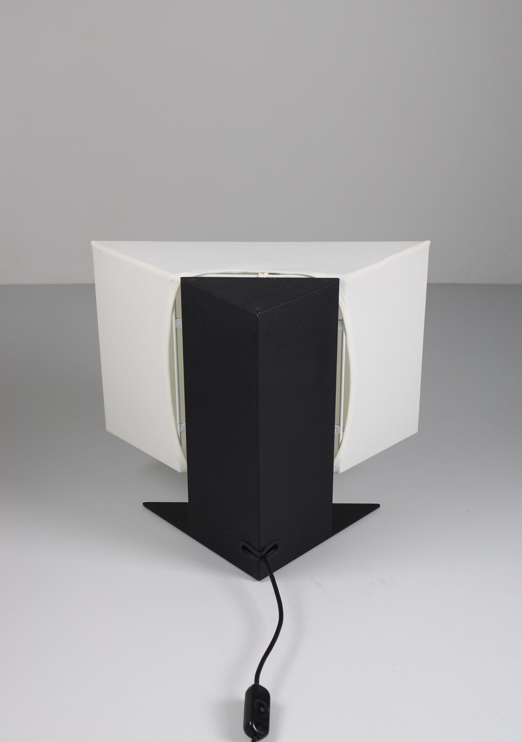 Rare table lamp, model Accademia designed by Cini Boeri for Artemide, Italy 1978. The lamp has a black painted metal base and a white polyester shade which gives a nice warm glow when illuminated. It has a sleek and modern design, since the lamp is designed in a triangle, it would be perfect for a corner. This is the small version of the 2 sizes there were made in the table version. Equipped with two E27 sockets. Overall excellent good condition with very minor sings of use.