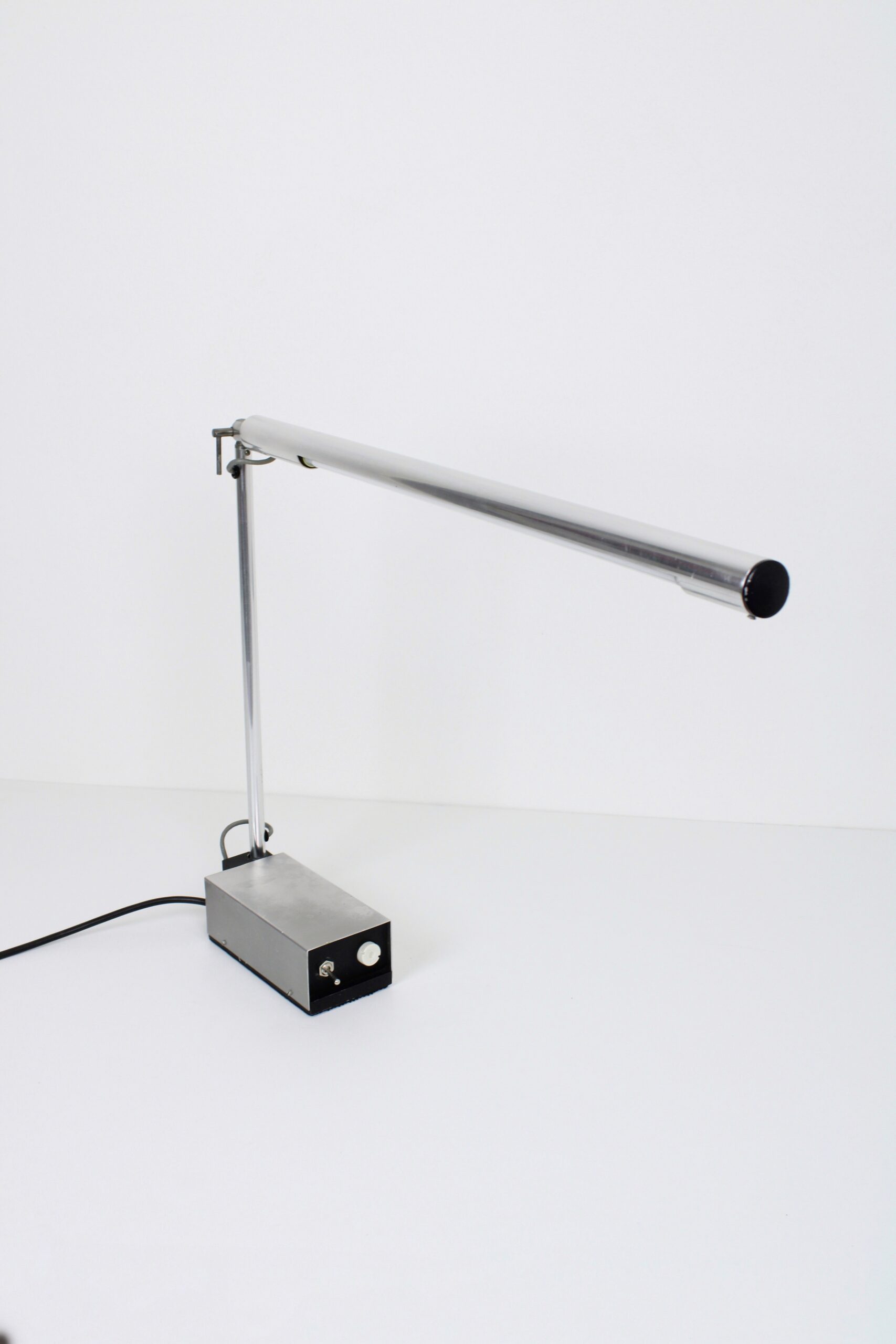 Rare desk lamp, model KMll designed by Gerald Abramovitz for Best & Lloyd, Ltd., Birmingham, United Kingdom 1961. This unique desk lamp was only produced for 2 years, from 1961 to 1963. The mid-century modern design of this lamp has unique details and is very user-friendly. Made of a weighted base with an aluminum cover.