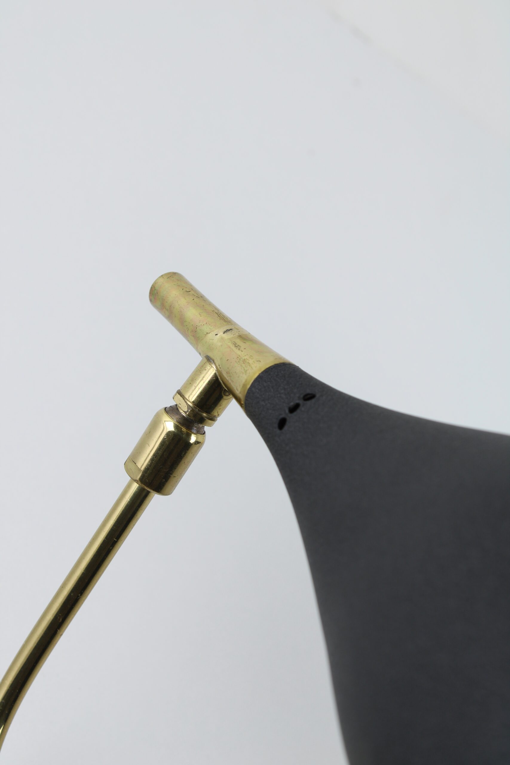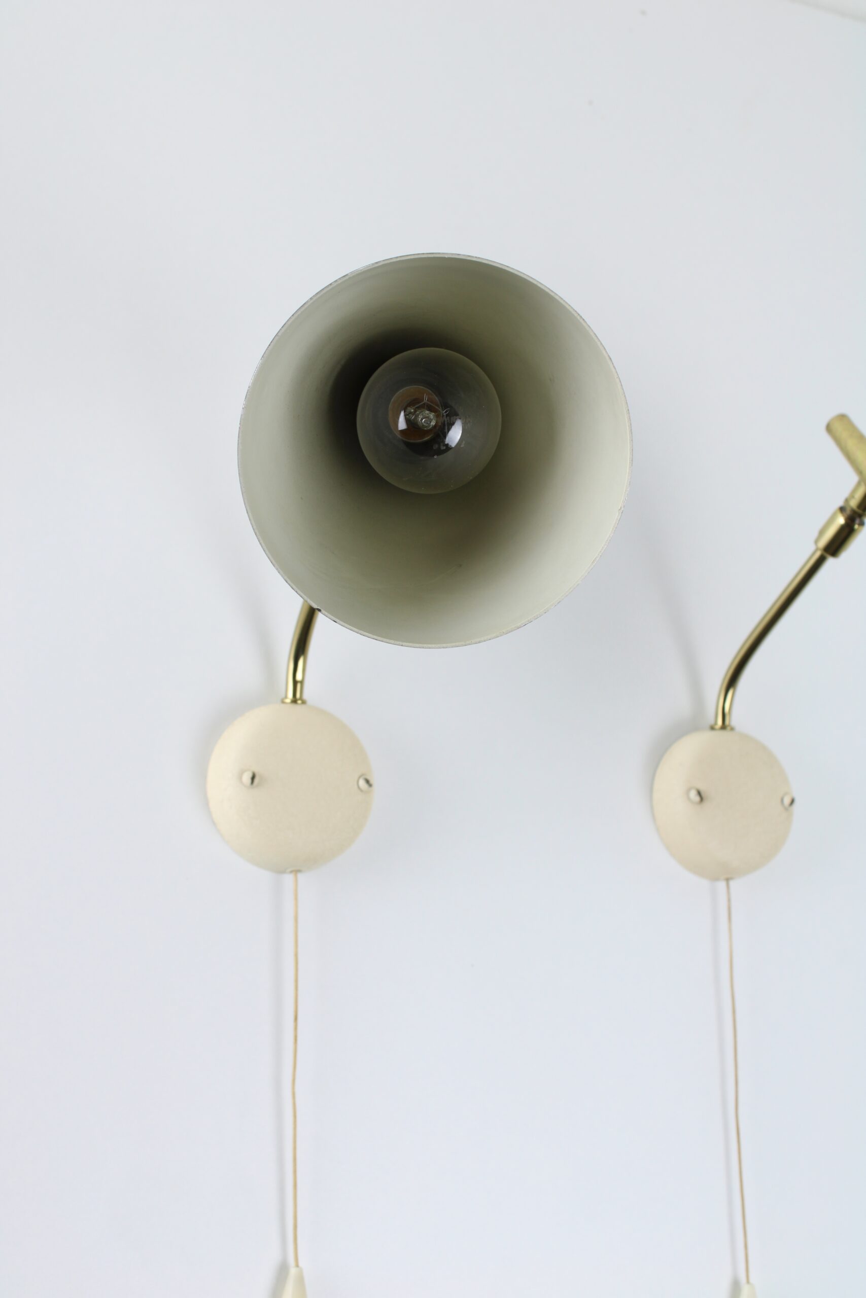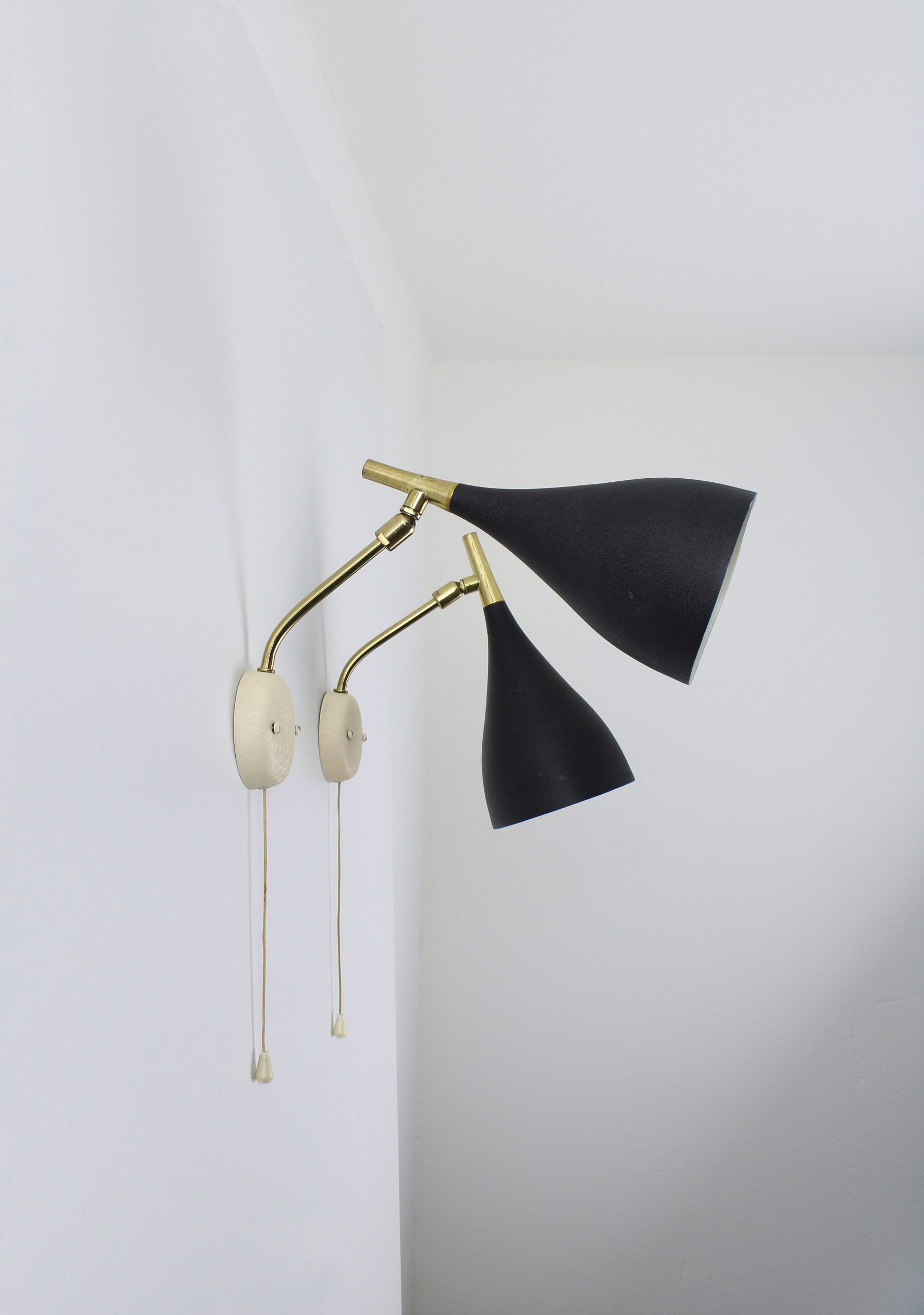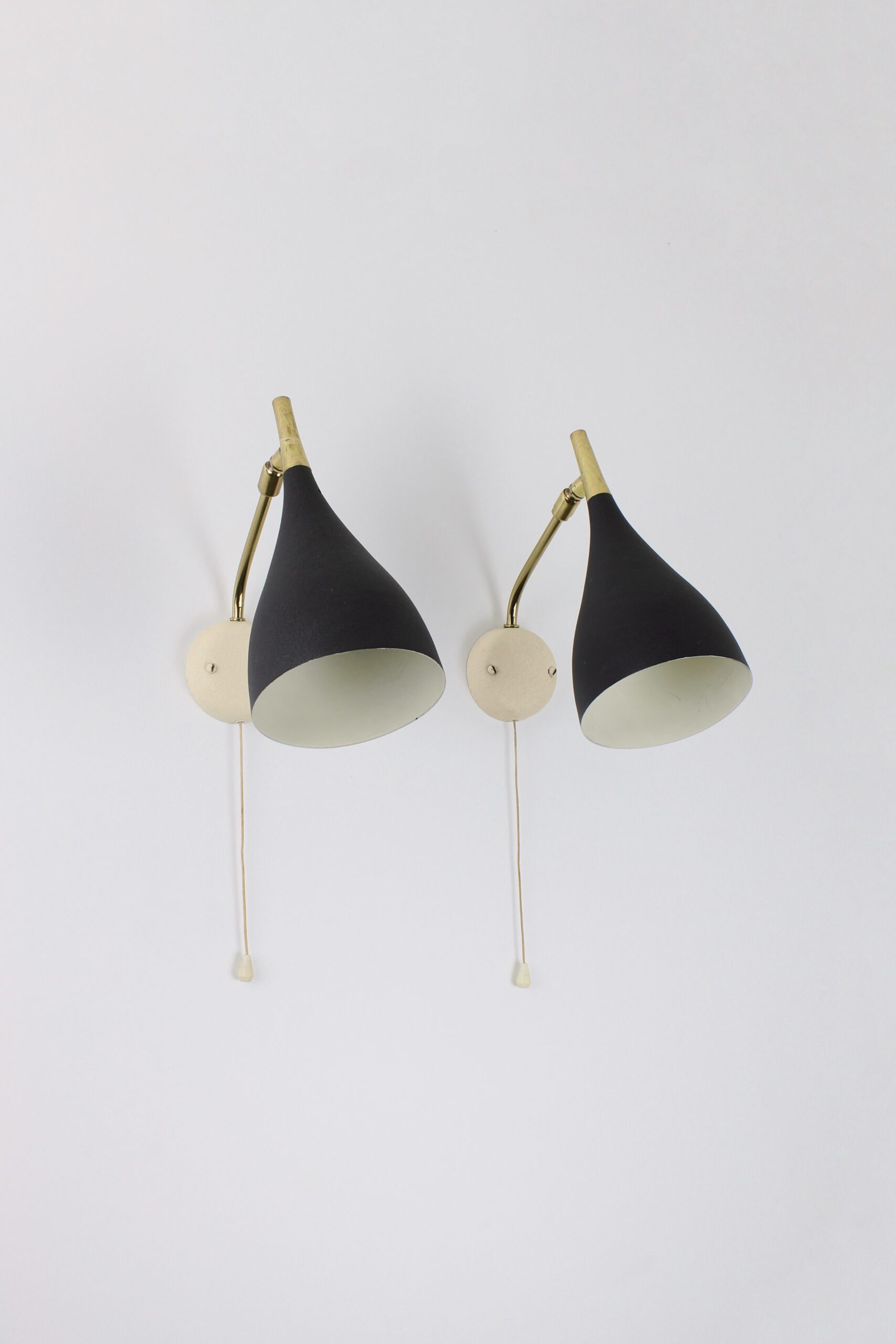 Set of two mid-century wall sconces made by the German lighting manufacturer Cosack Leuchten in the 1950s. These sconces consist of patinated brass and black/beige shrink lacquered metal. The shades are adjustable, and both lamps are fully complete and original. This streamlined design is a great example of mid-century modernism. In very good condition with minor signs of use.