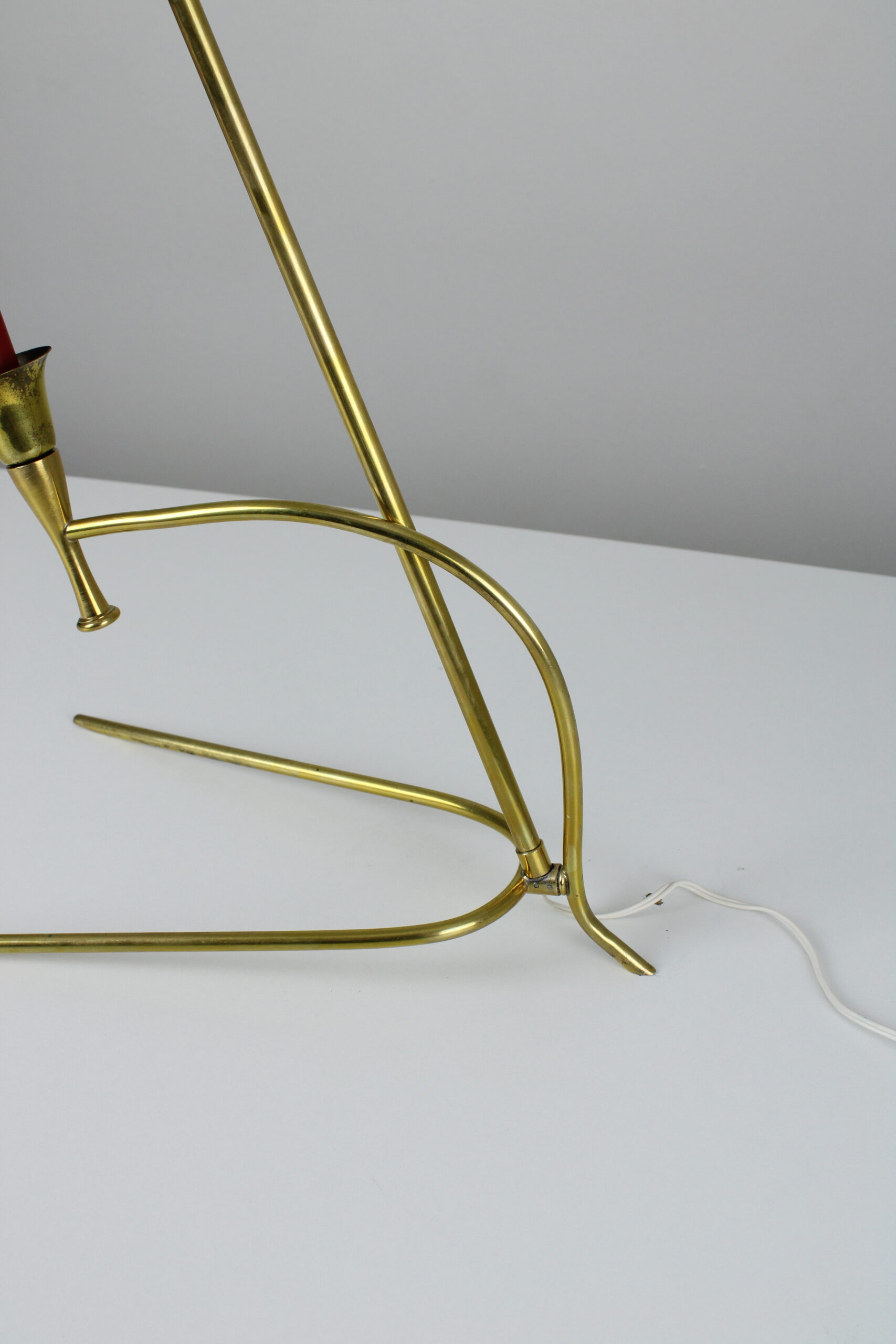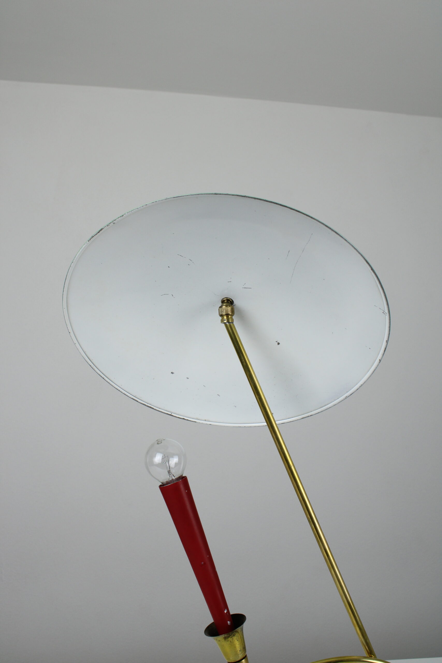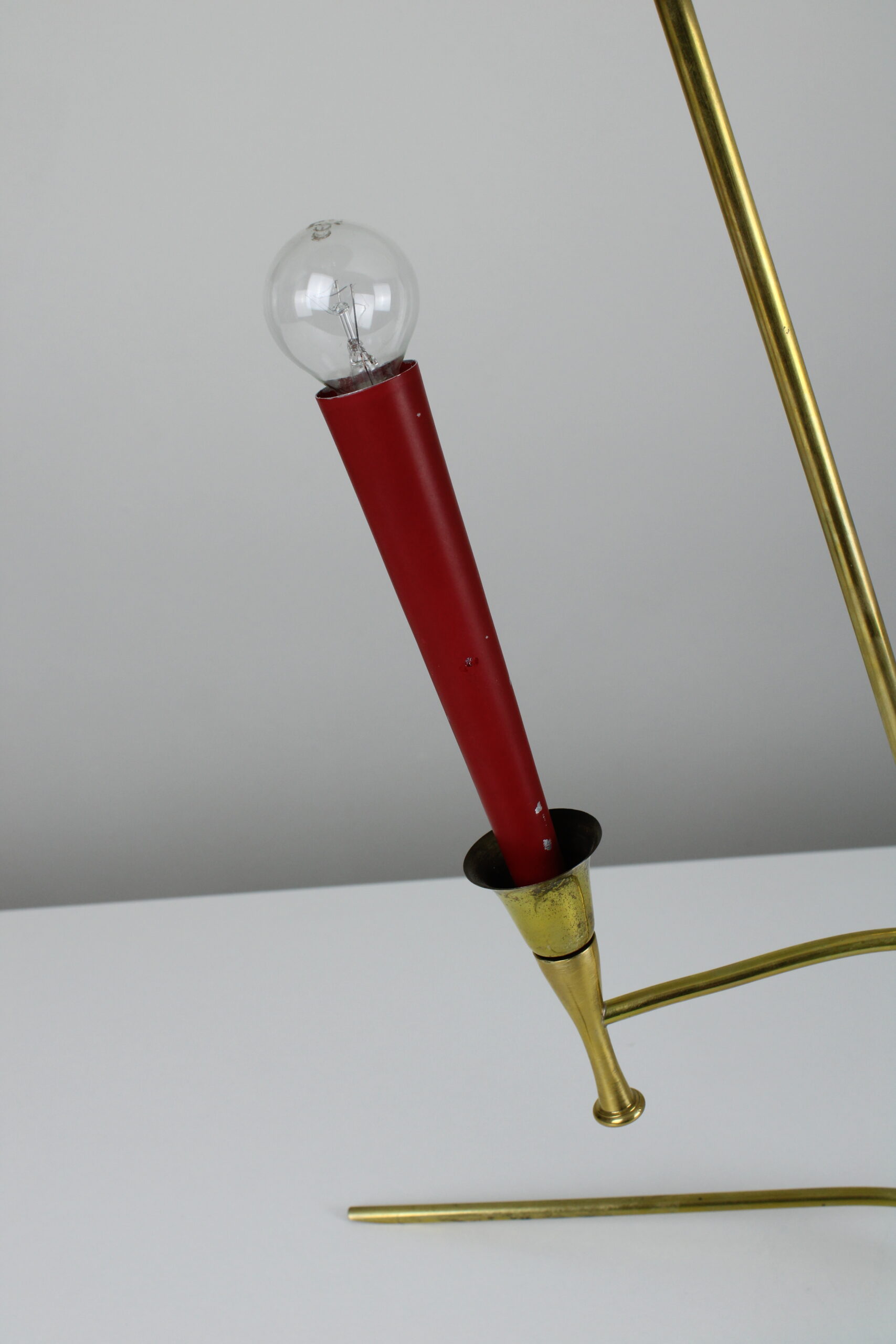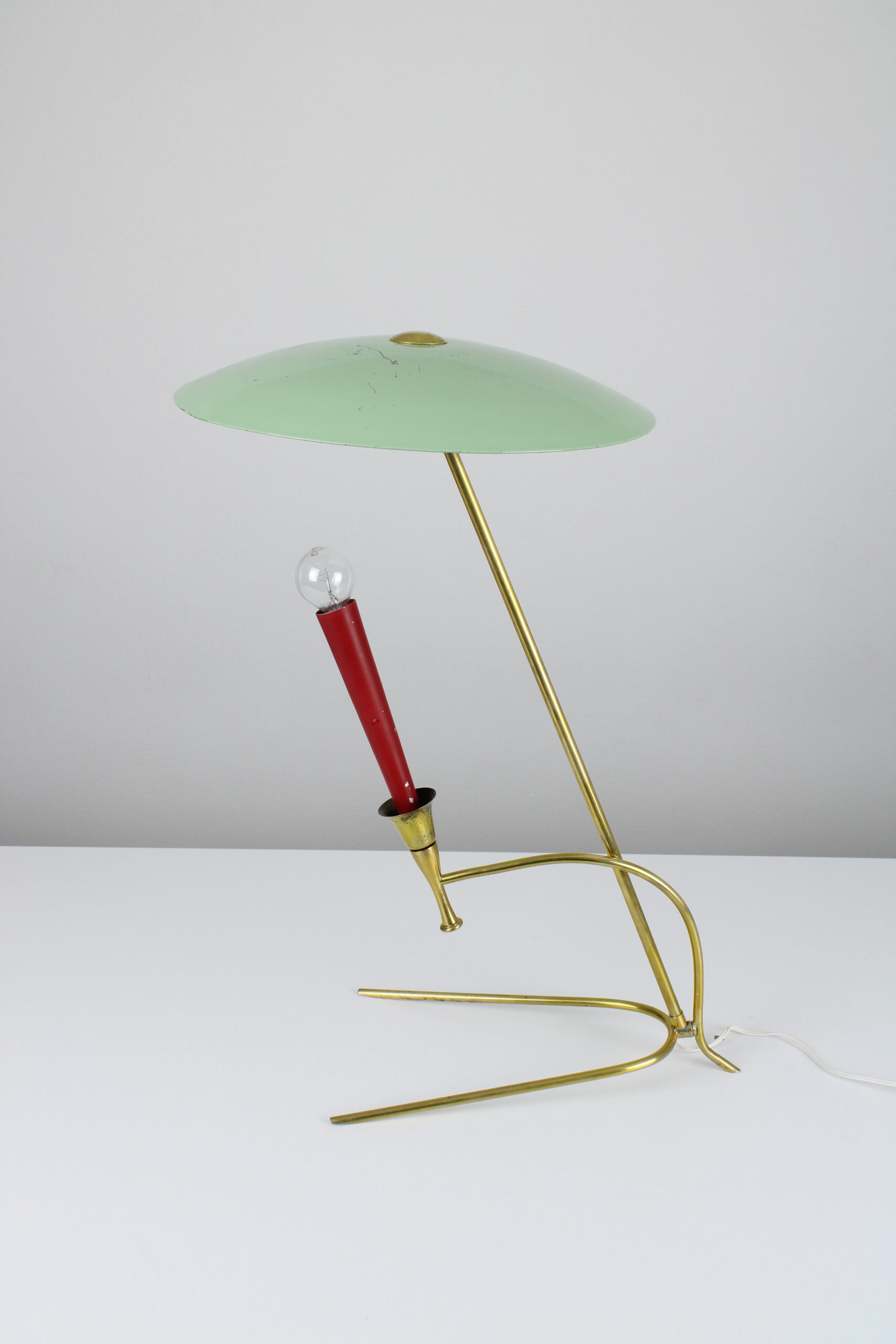 Brass desk lamp manufactured in France circa 1950s. The design of this lamp features a brass structure with smooth curves and patina. On this lamp you can find typical French colors from the 50s. Mint green and Bordeaux red were very popular at that time. A unique lamp in good condition with some small paint damage on the green shade.