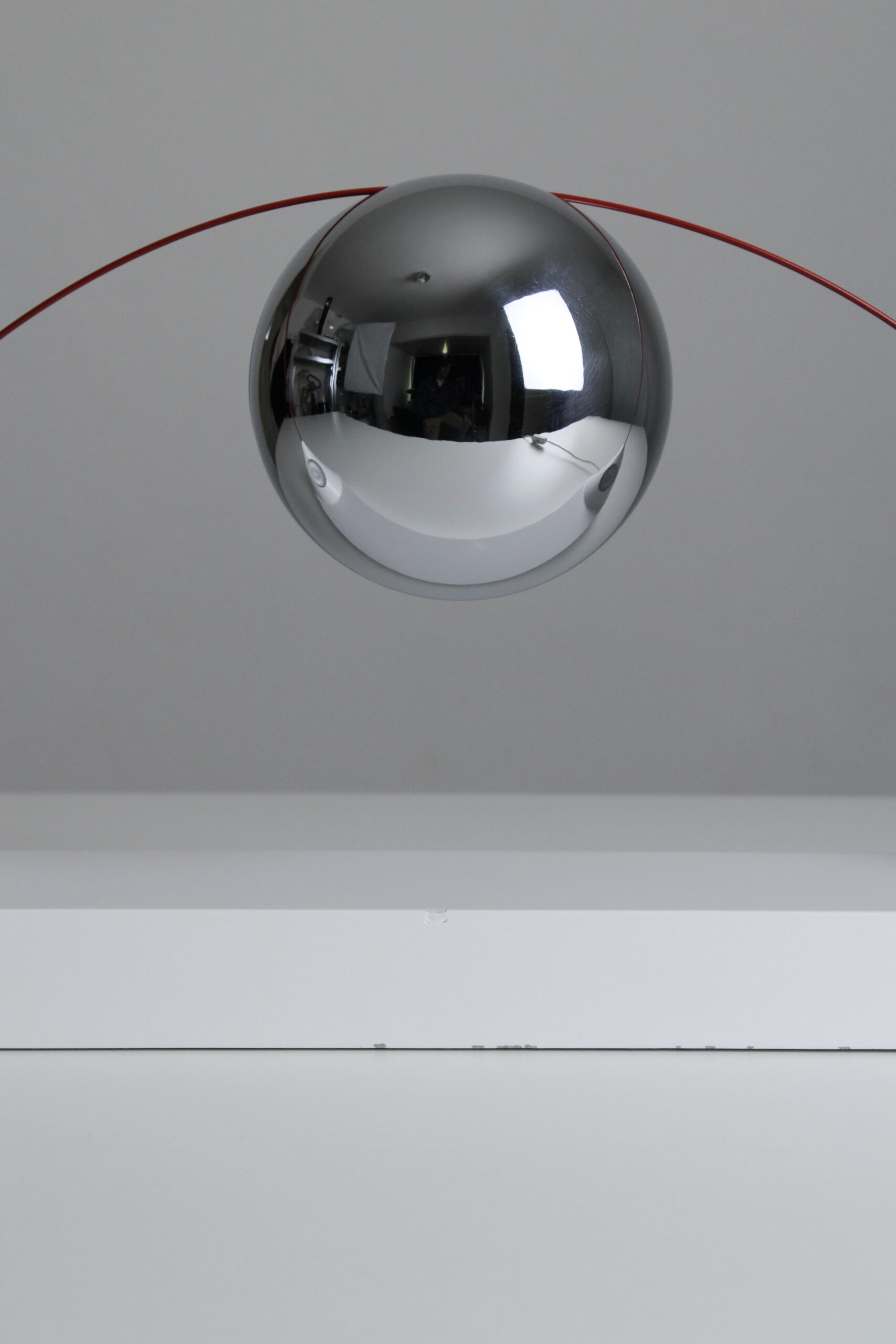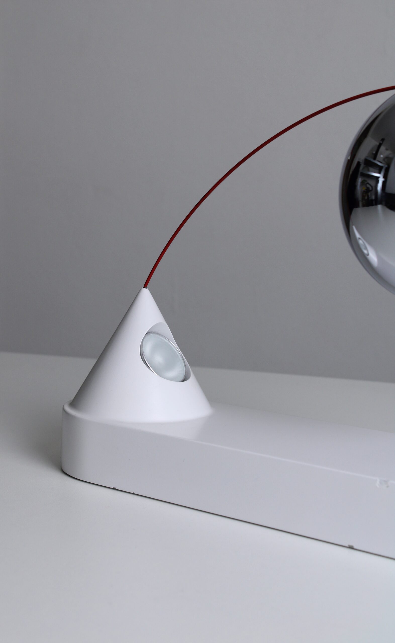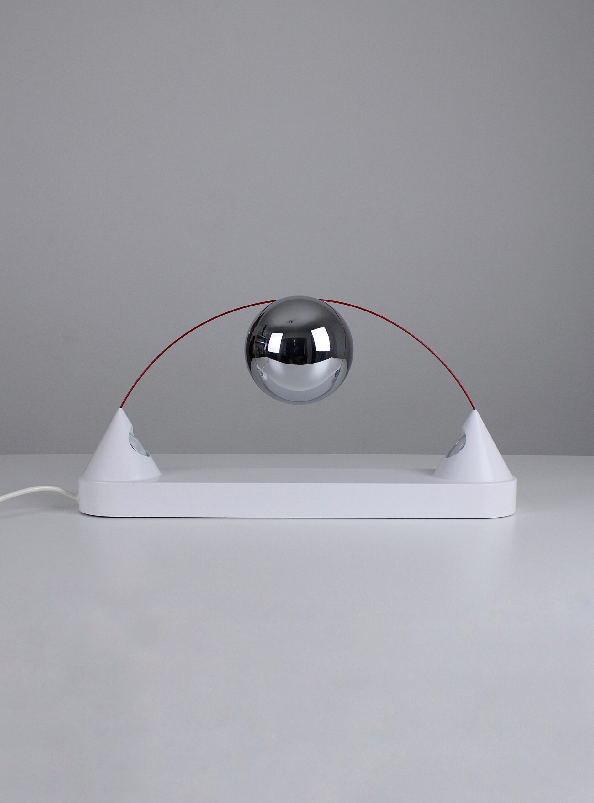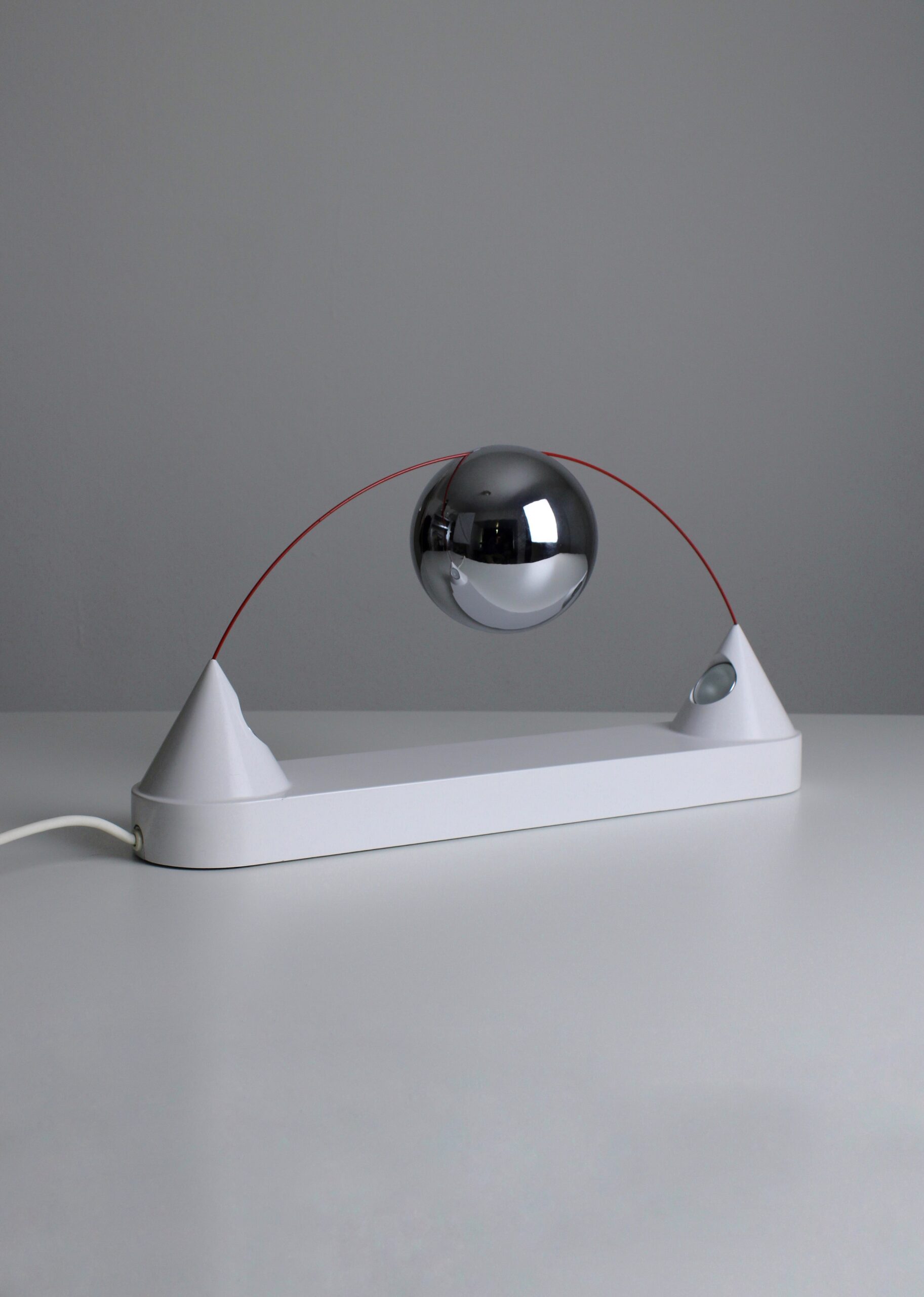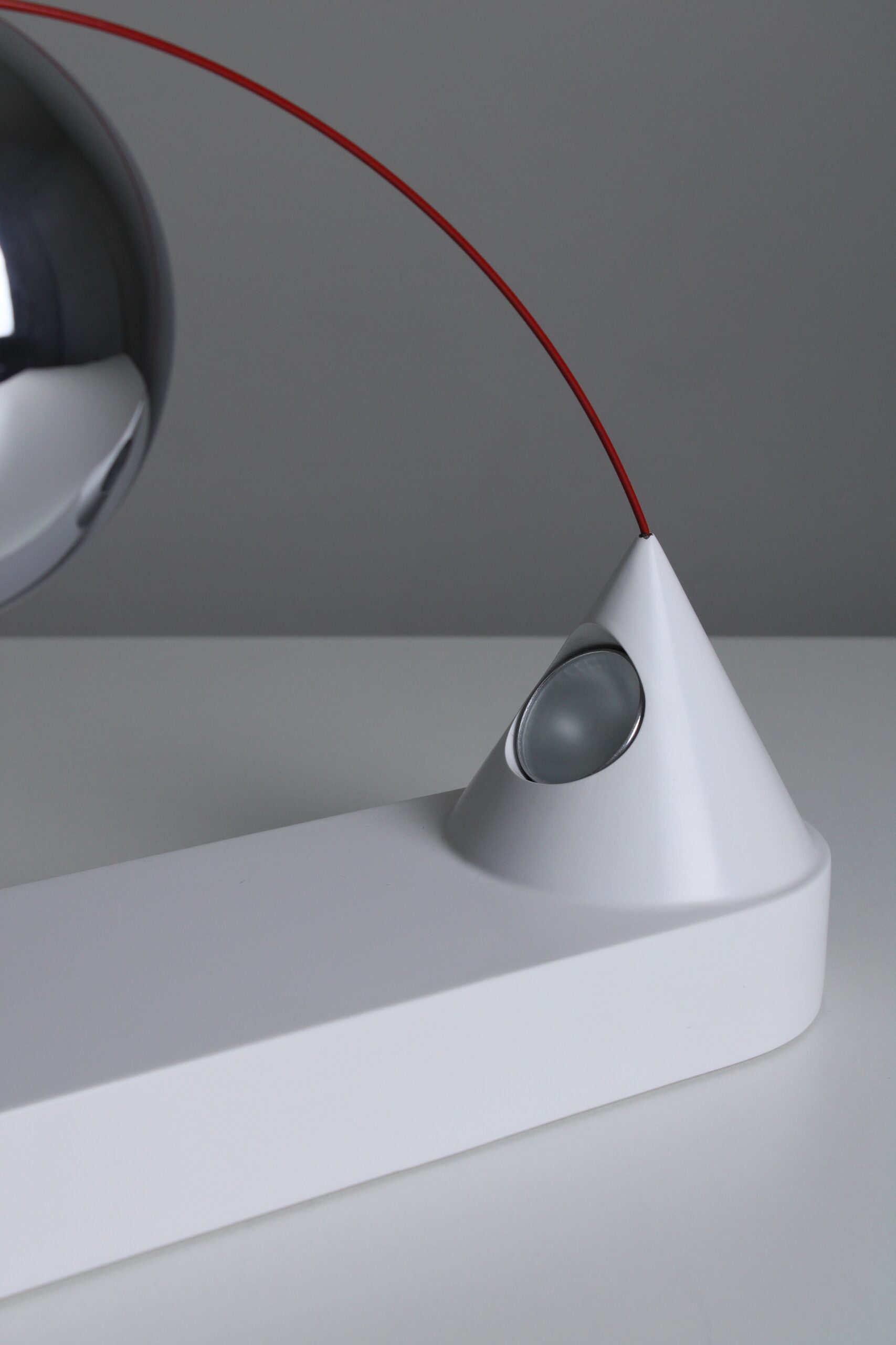 Very rare table lamp, model Mercurio. Designed by Peppe di Giuli in 1971. Produced by Sirrah in Italy. Named after the planet Mercury. This lamp holds two halogen light bulbs that shine the light towards the chrome sphere. A unique lamp in very good condition with minor signs of use. Two halogen lights are included.