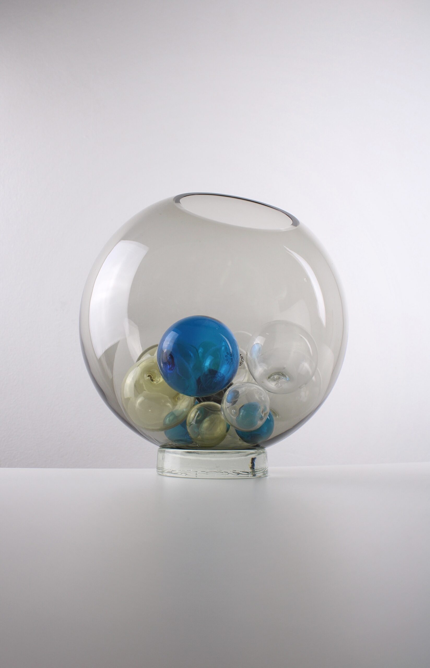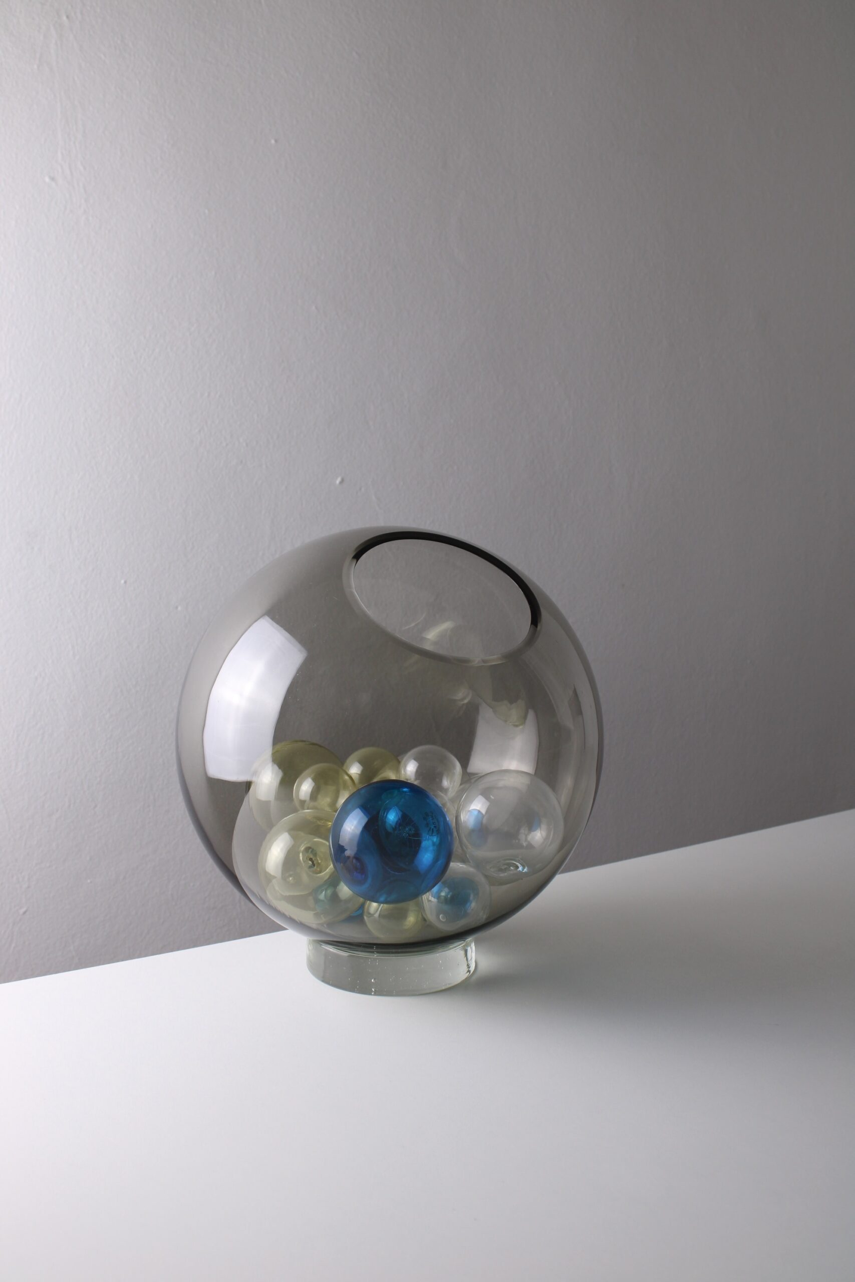 Rare table lamp, model Pallotta. Designed and made by Studio Venini, circa 1970. This design consists of a smoked transparent globe made of talpa glass. Inside of the lamp are several light yellow, blue and transparant polychrome balls. The Palotta series was produced in different sizes. It was also made as a hanging lamp. The overall condition of this lamp excellent. The lamp is complete and equipped with the original electronics.
