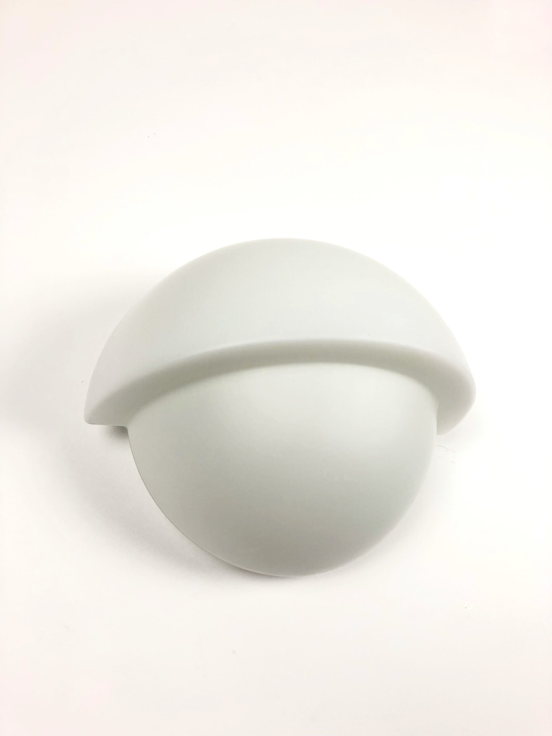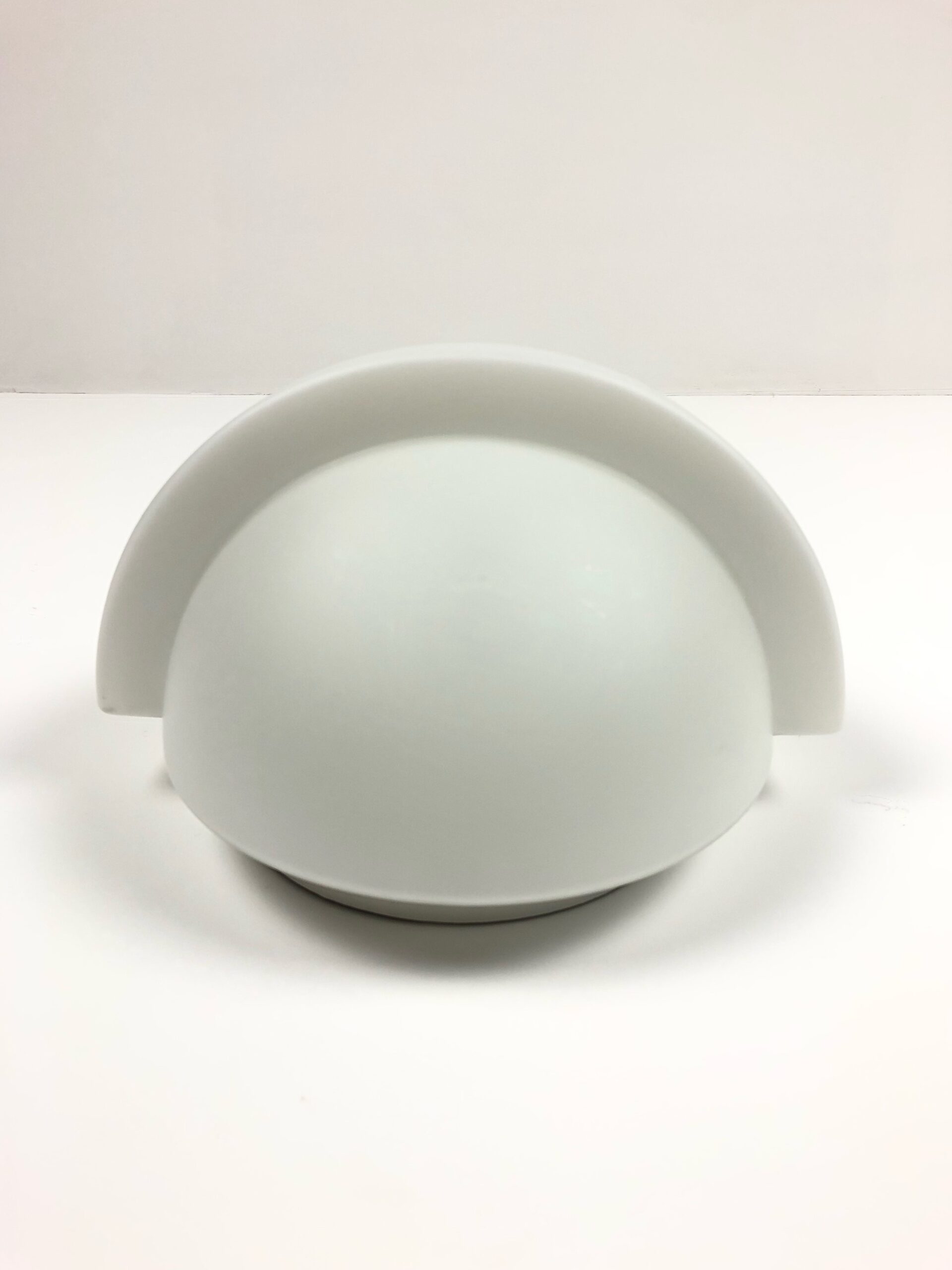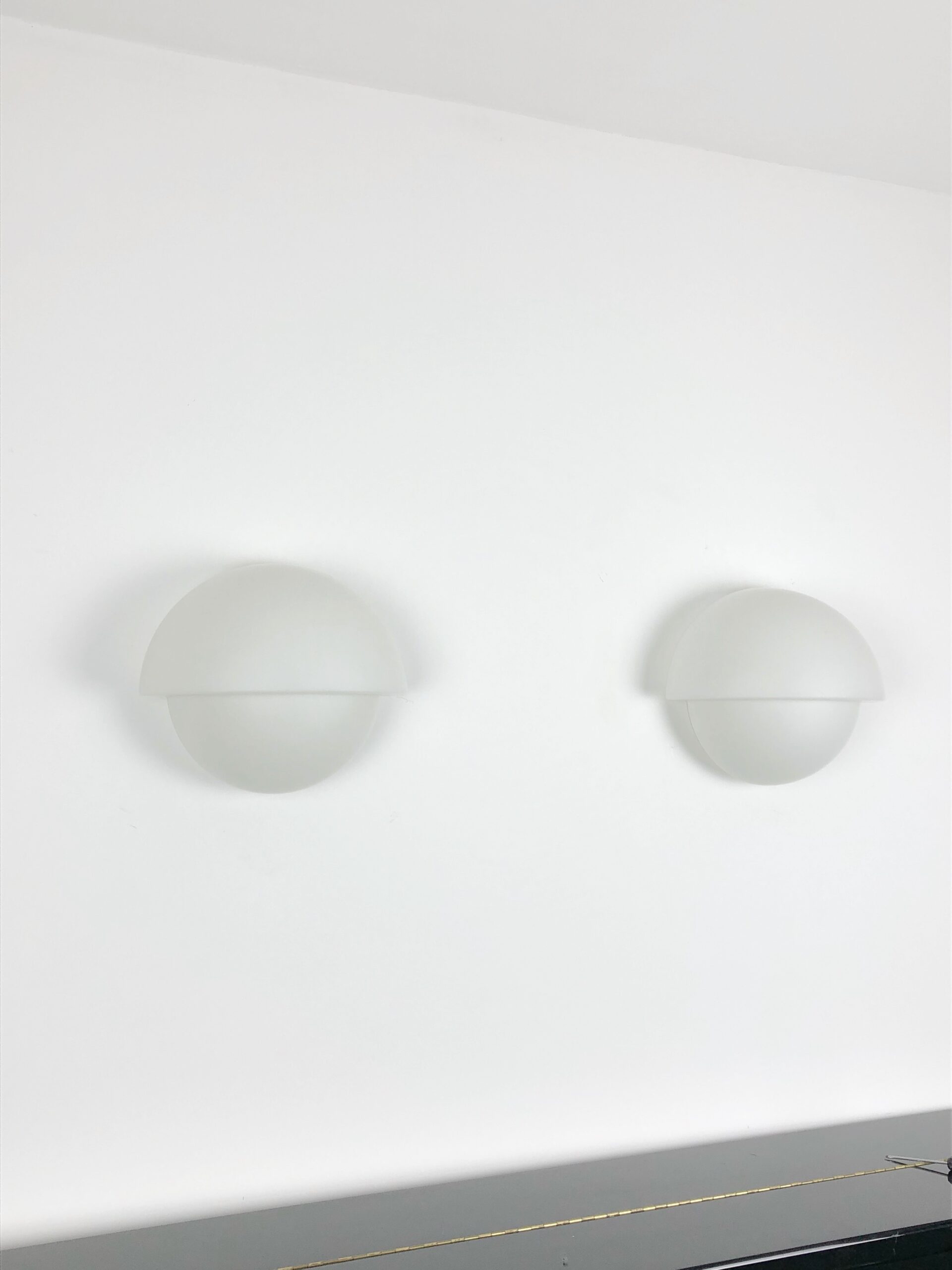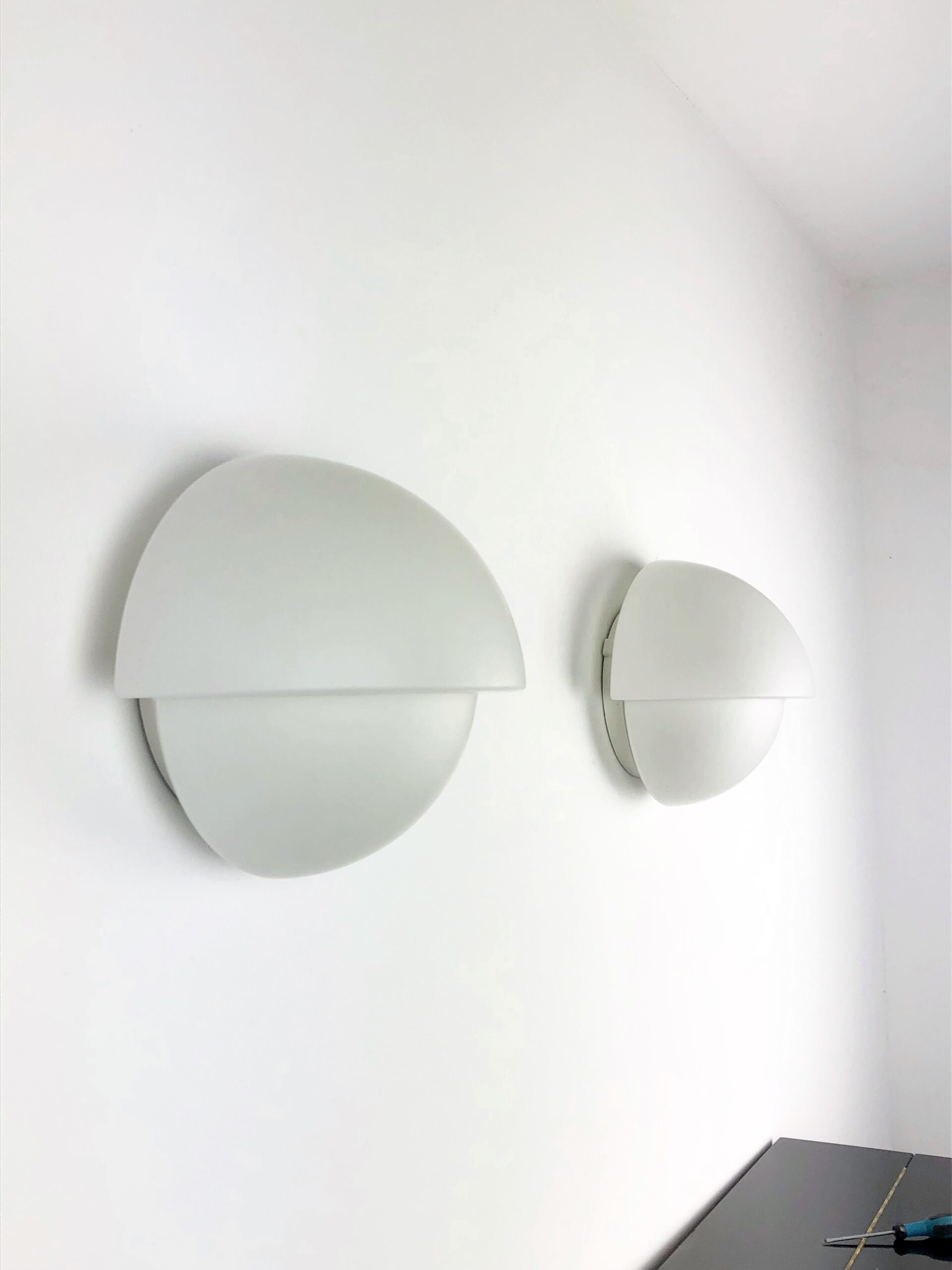 The design features 2 half globes overlapping each other. These lamps are made of white thick opal glass with a plastic armature. Inside are TL sockets. 2 light points included for each lamp.