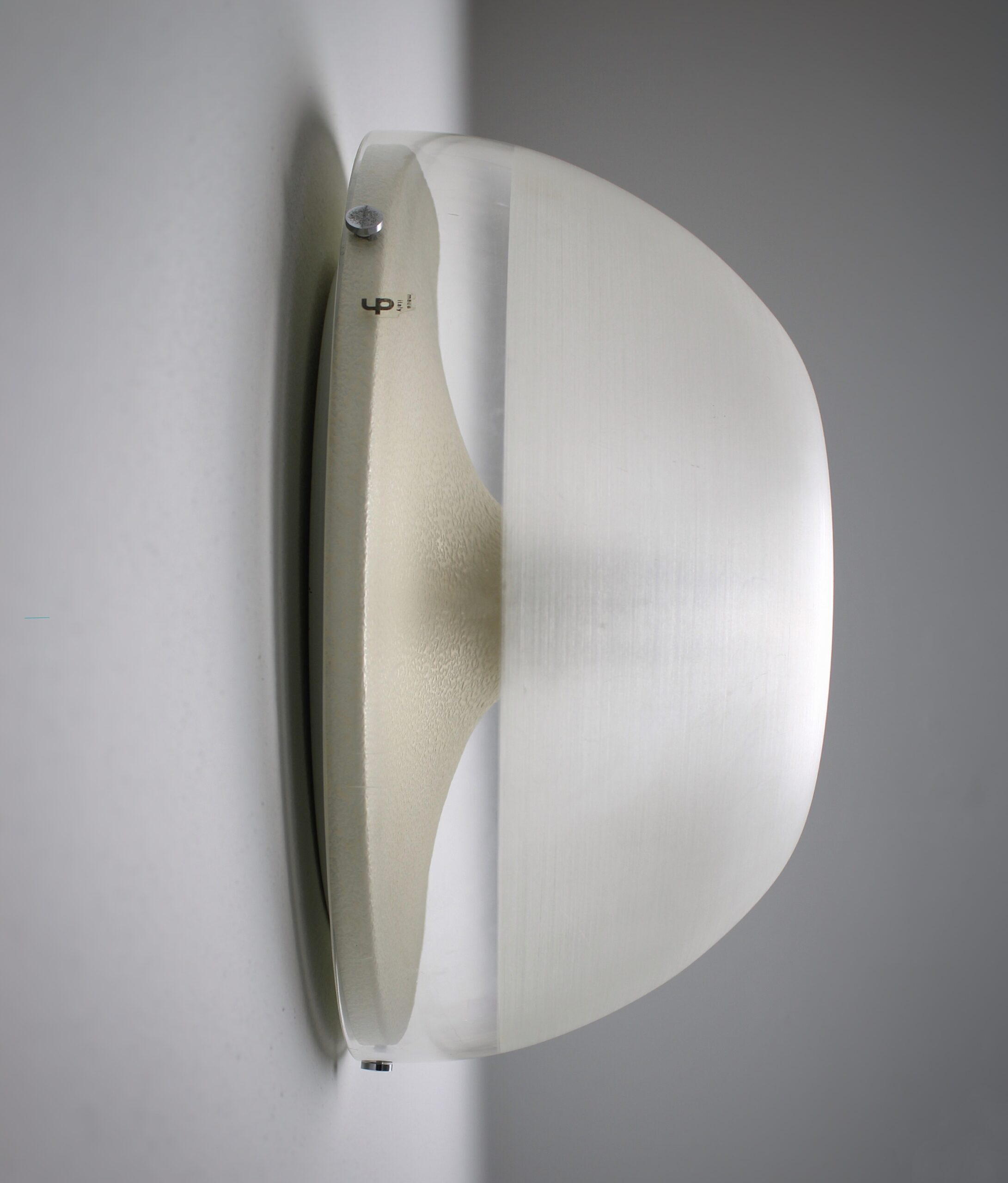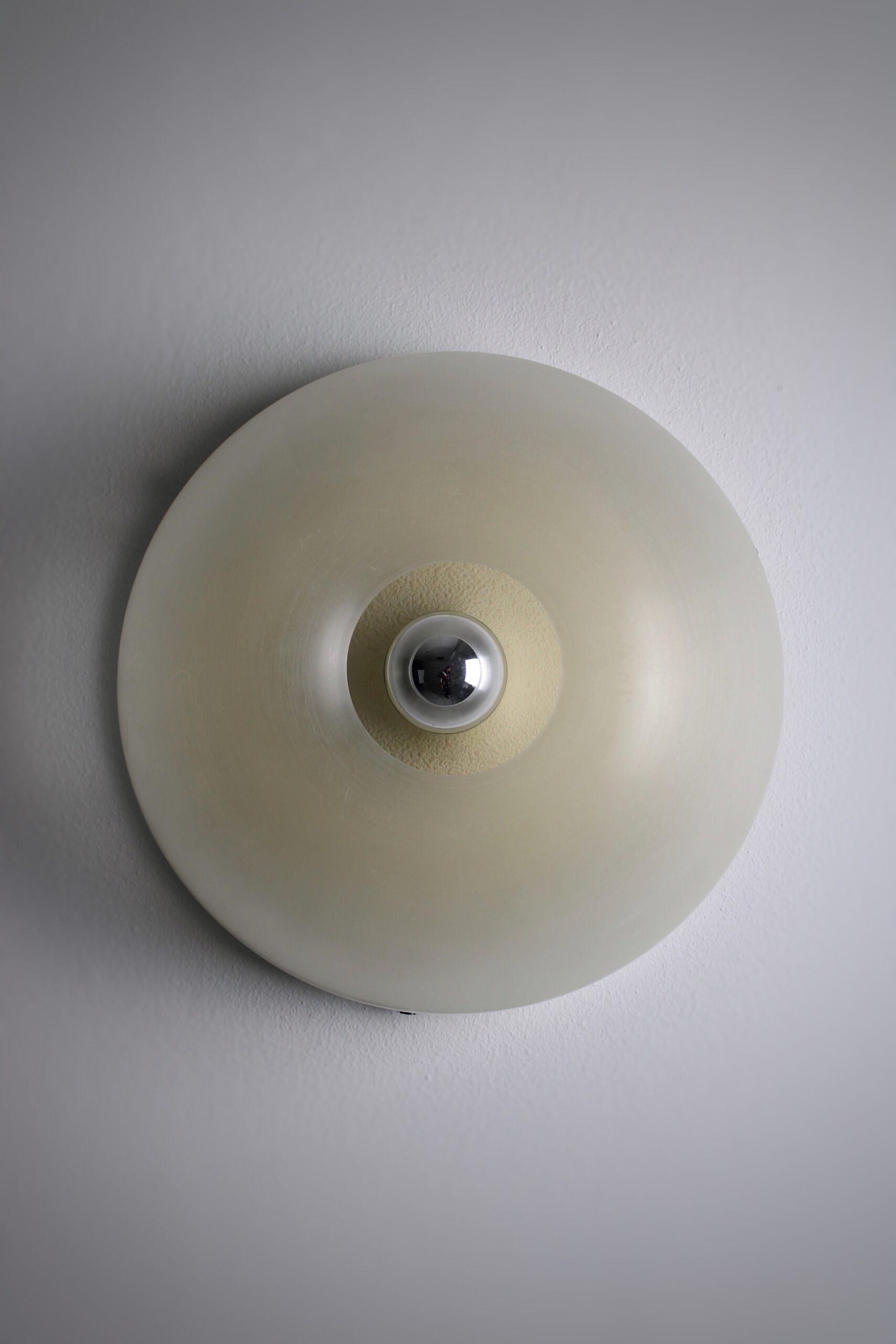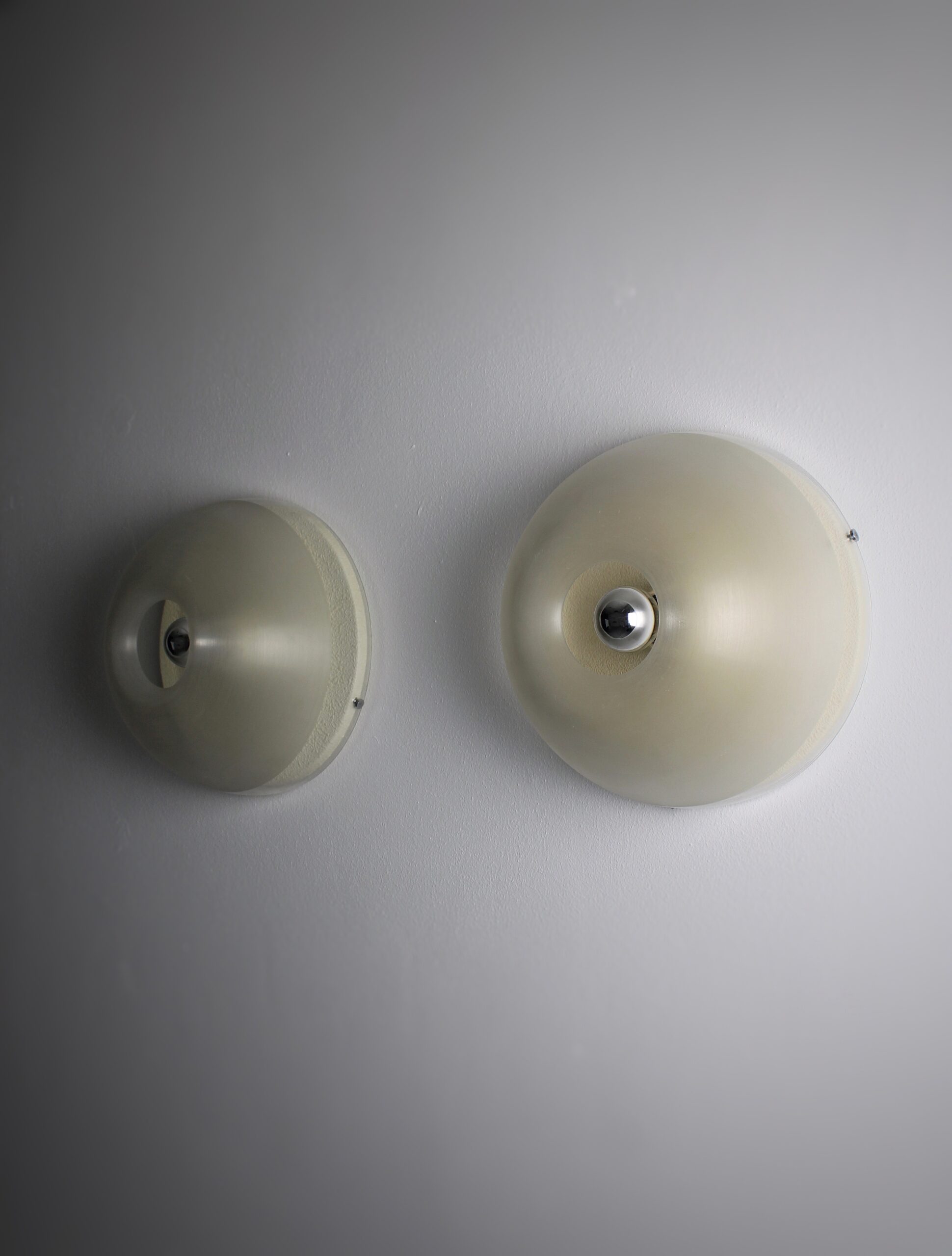 Pair of round wall lamps, model Tam-Tam. Created by an unknown Japanese designer named Yoshiko Hasabe in circa 1974. Produced by Design House, which was a part of the iGuzzini brand. The design features a half-sphere that consists of a metheacylate shade and a white metal wall plate. The shade is partially faded to create a diffuse light. It works best in combination with mirrored bulbs. The same shade of this lamp was used in the Focus lighting series by Fabio Lenci. Our lamps remain in very good condition with minor signs of use and age. The lamp is marked with an iGuzzini sticker. A copy of the lamps featured in the Guzzini catalog will be included in the sale.