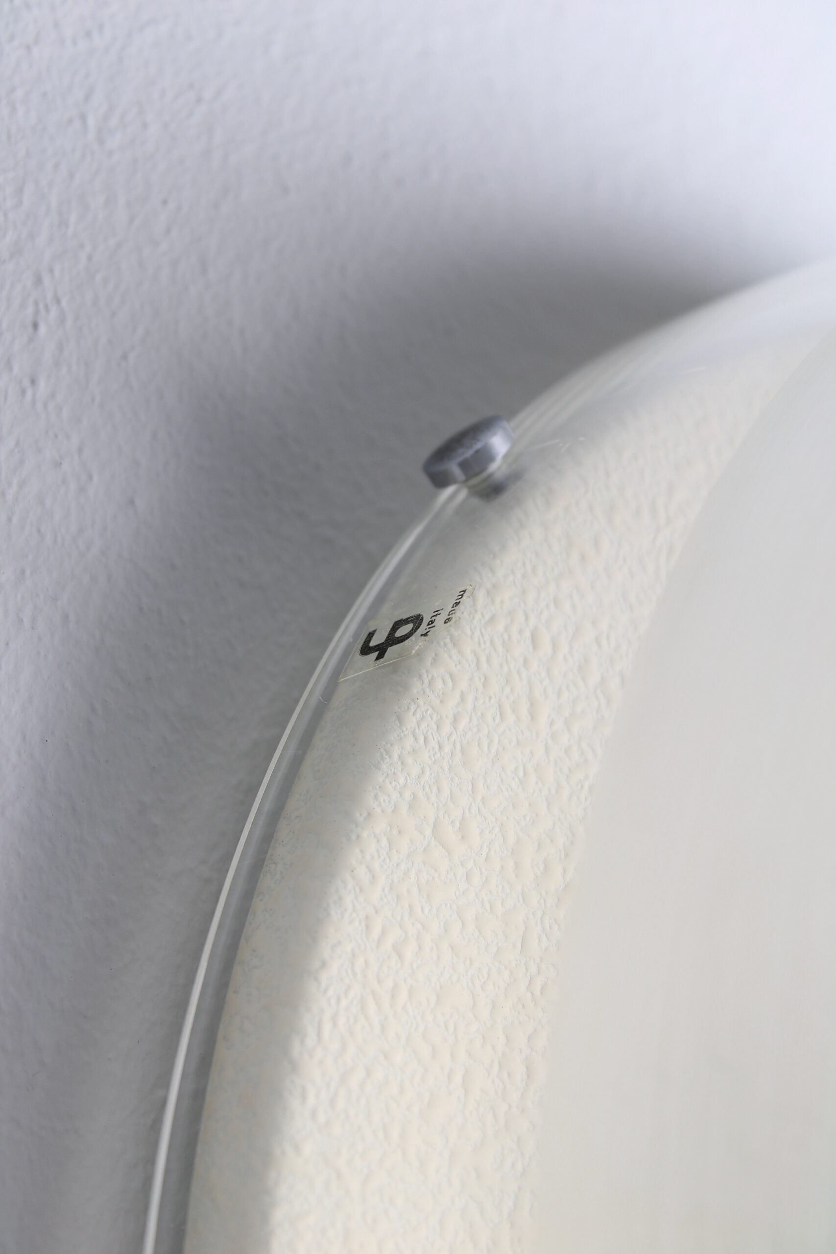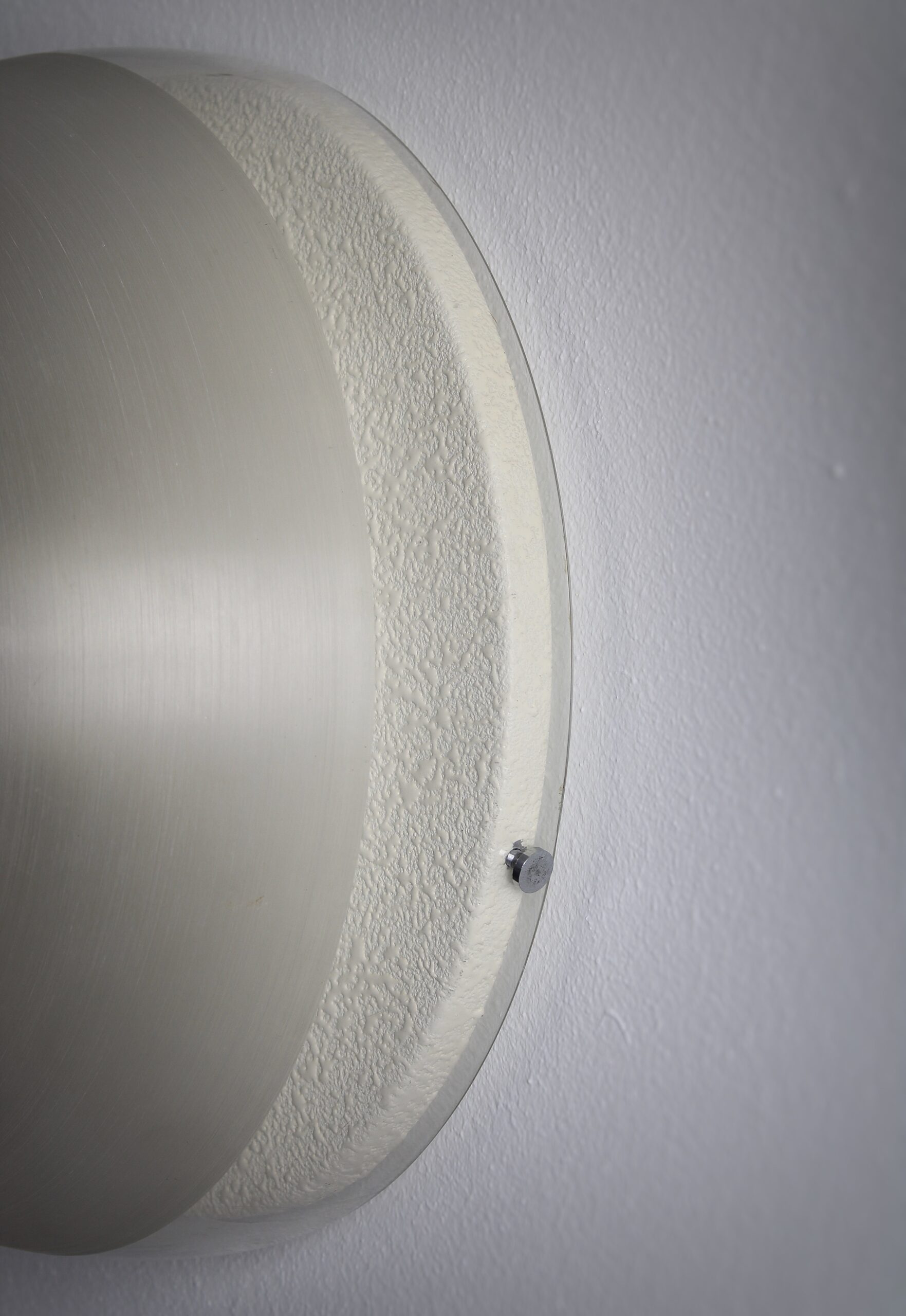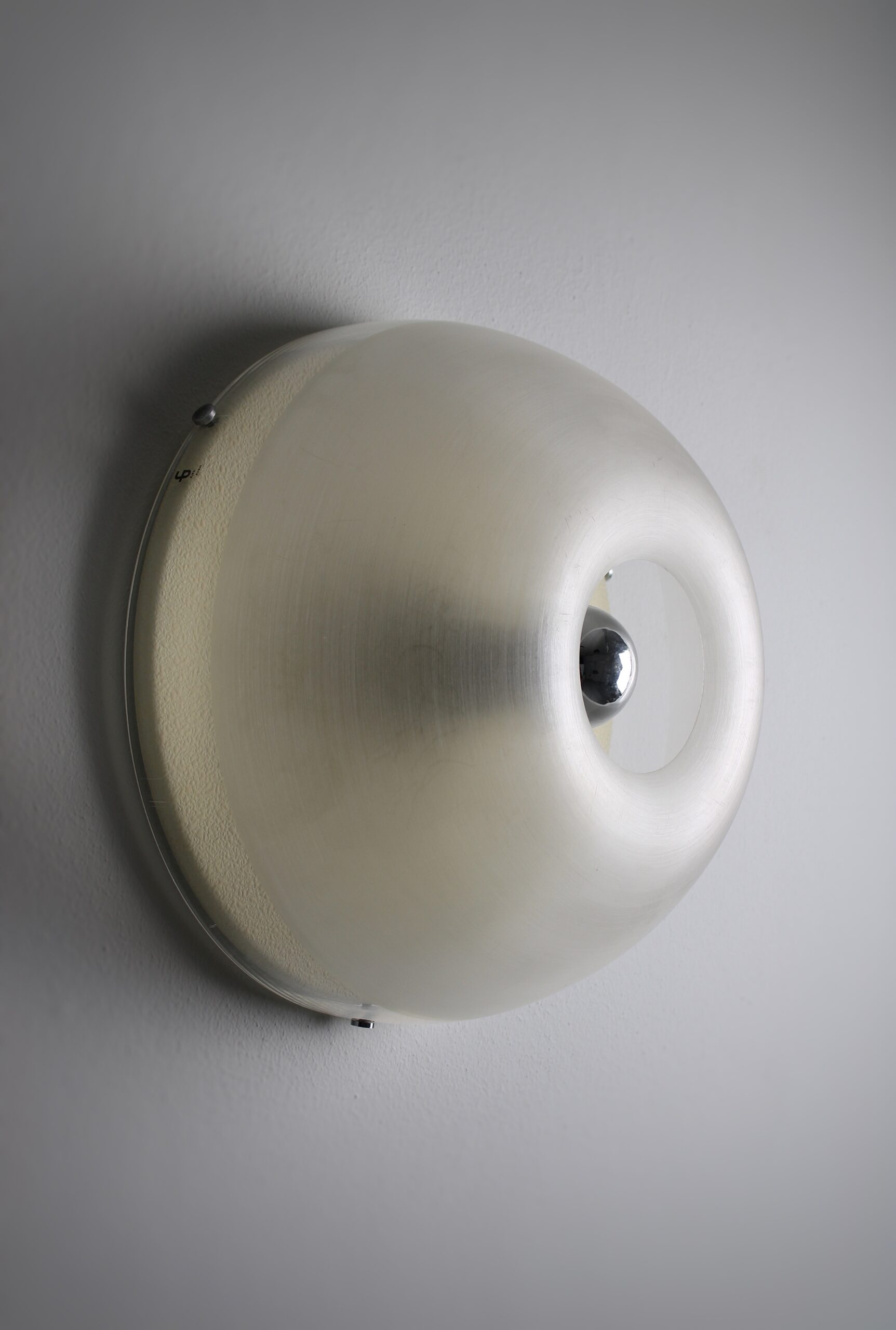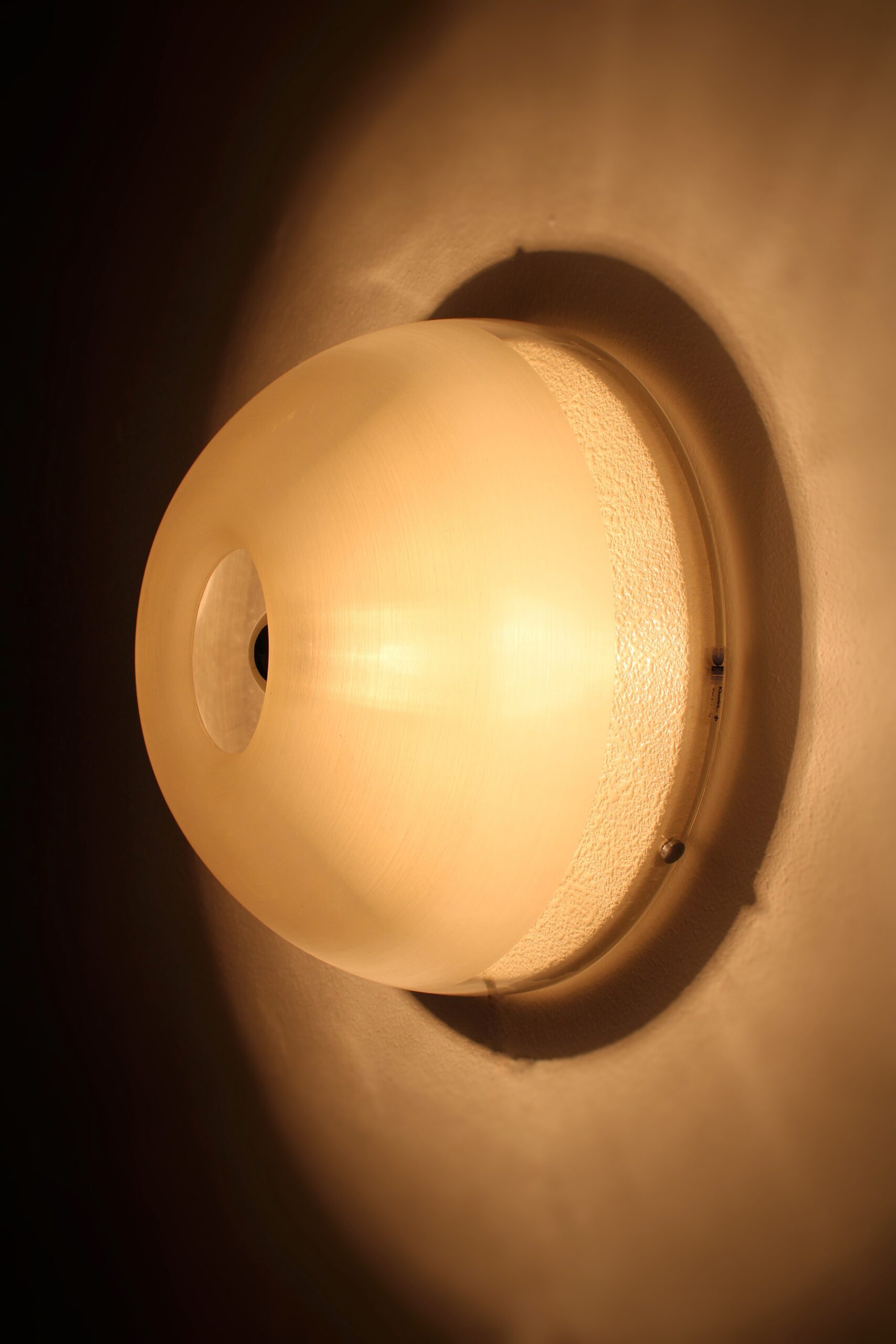 Pair of round wall lamps, model Tam-Tam. Created by an unknown Japanese designer named Yoshiko Hasabe in circa 1974. Produced by Design House, which was a part of the iGuzzini brand. The design features a half-sphere that consists of a metheacylate shade and a white metal wall plate. The shade is partially faded to create a diffuse light. It works best in combination with mirrored bulbs. The same shade of this lamp was used in the Focus lighting series by Fabio Lenci. Our lamps remain in very good condition with minor signs of use and age. The lamp is marked with an iGuzzini sticker. A copy of the lamps featured in the Guzzini catalog will be included in the sale.