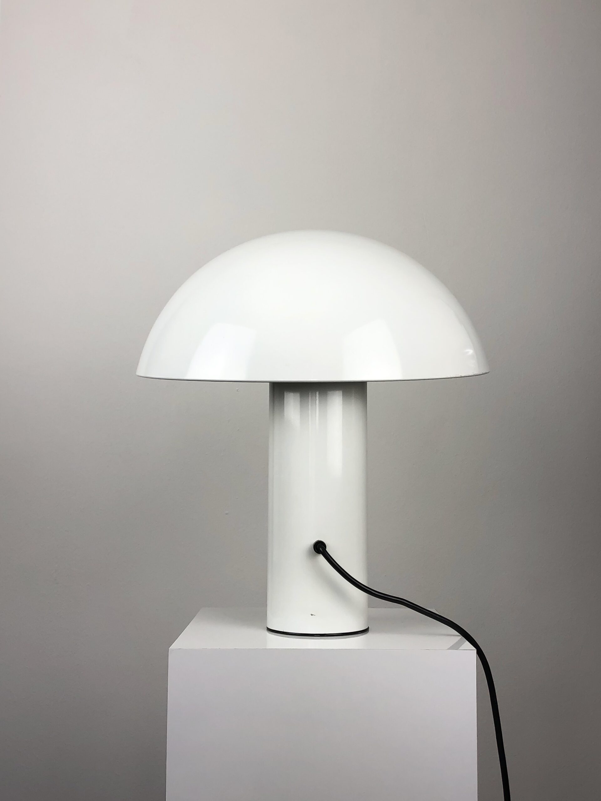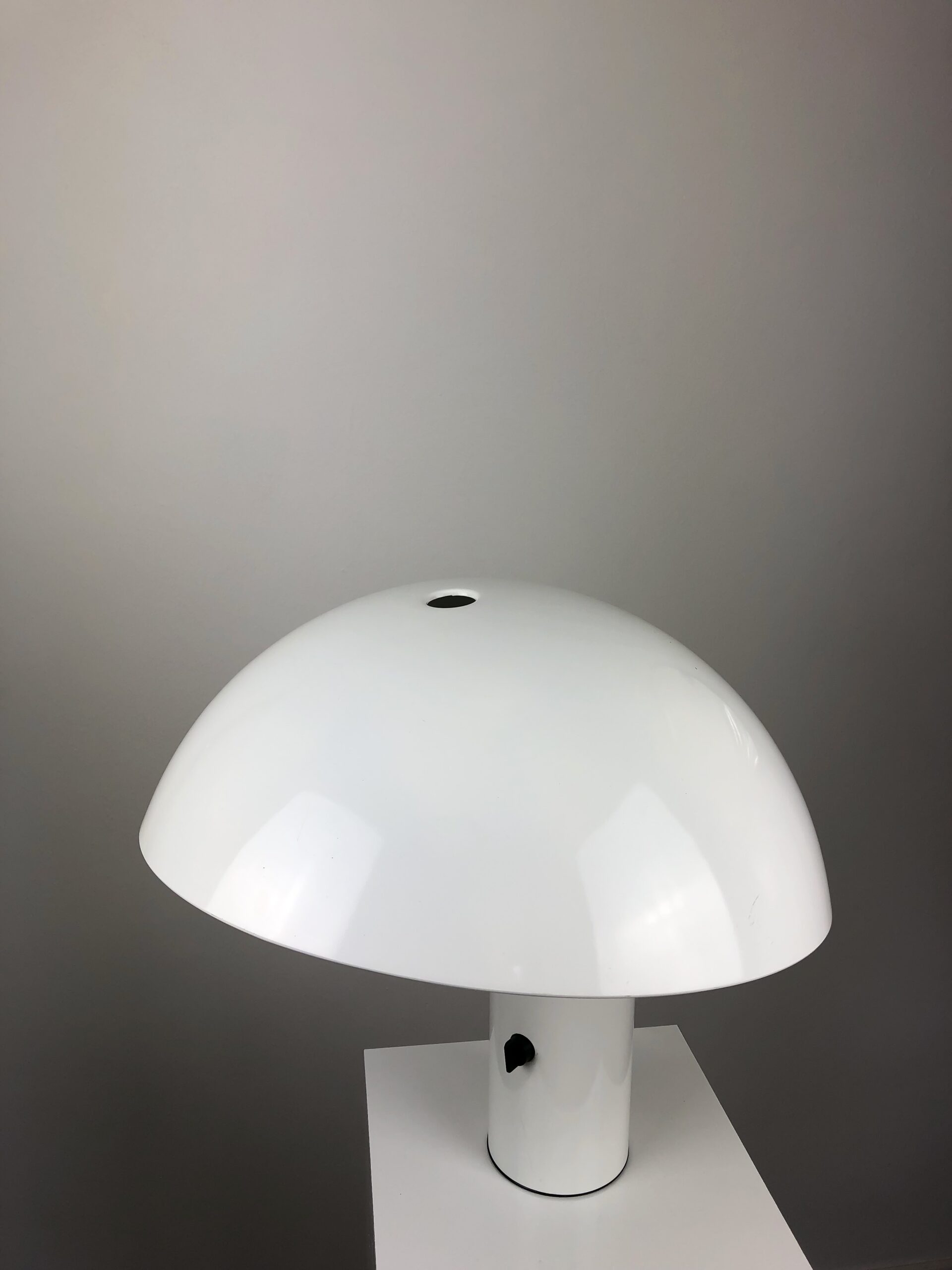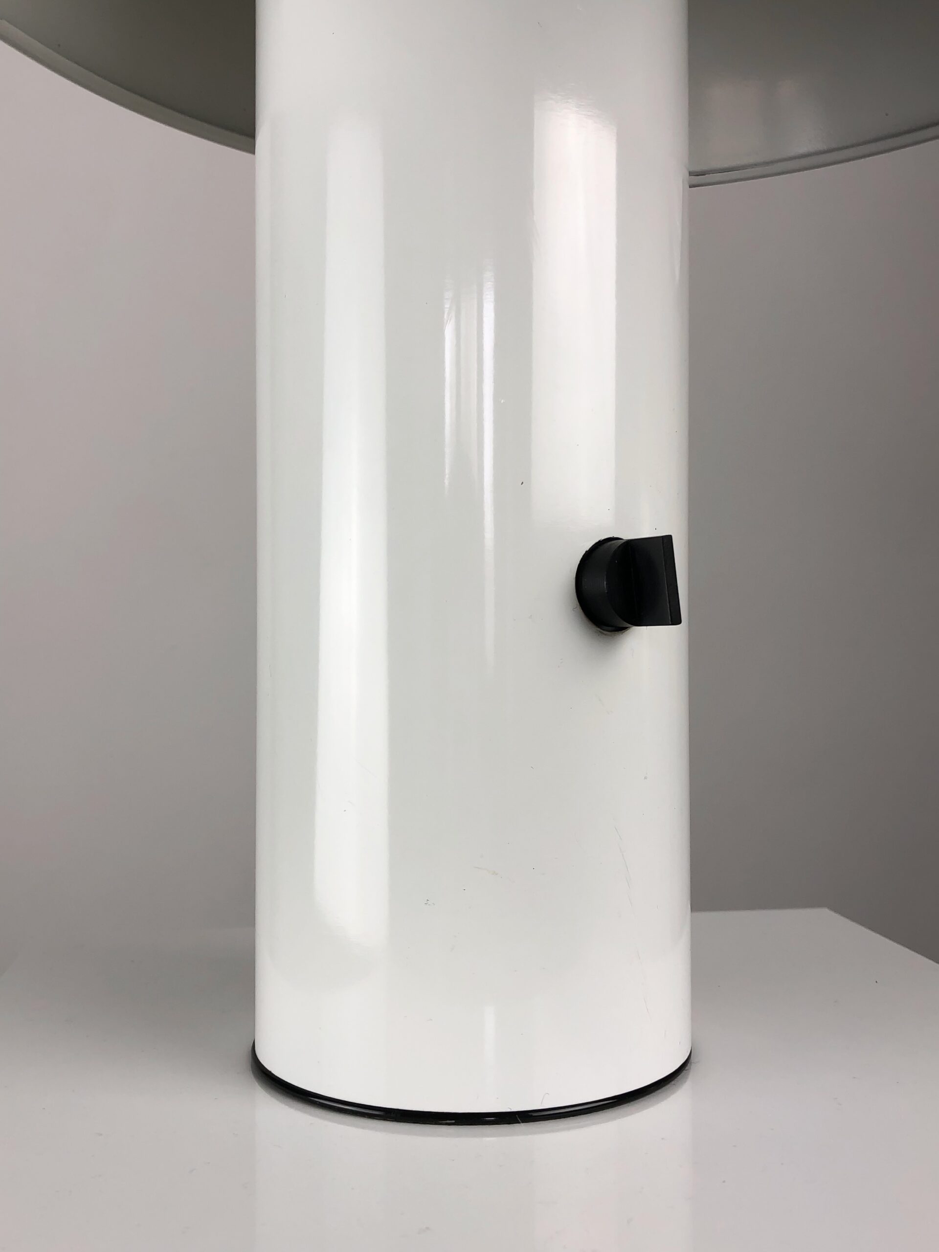 This lamp consists of a heavy white cone that holds a fairly wide emailed shade. On the base in an on / off switch that also works as a dimmer. The lamp is in overall very good condition with some minor traces of usage.
