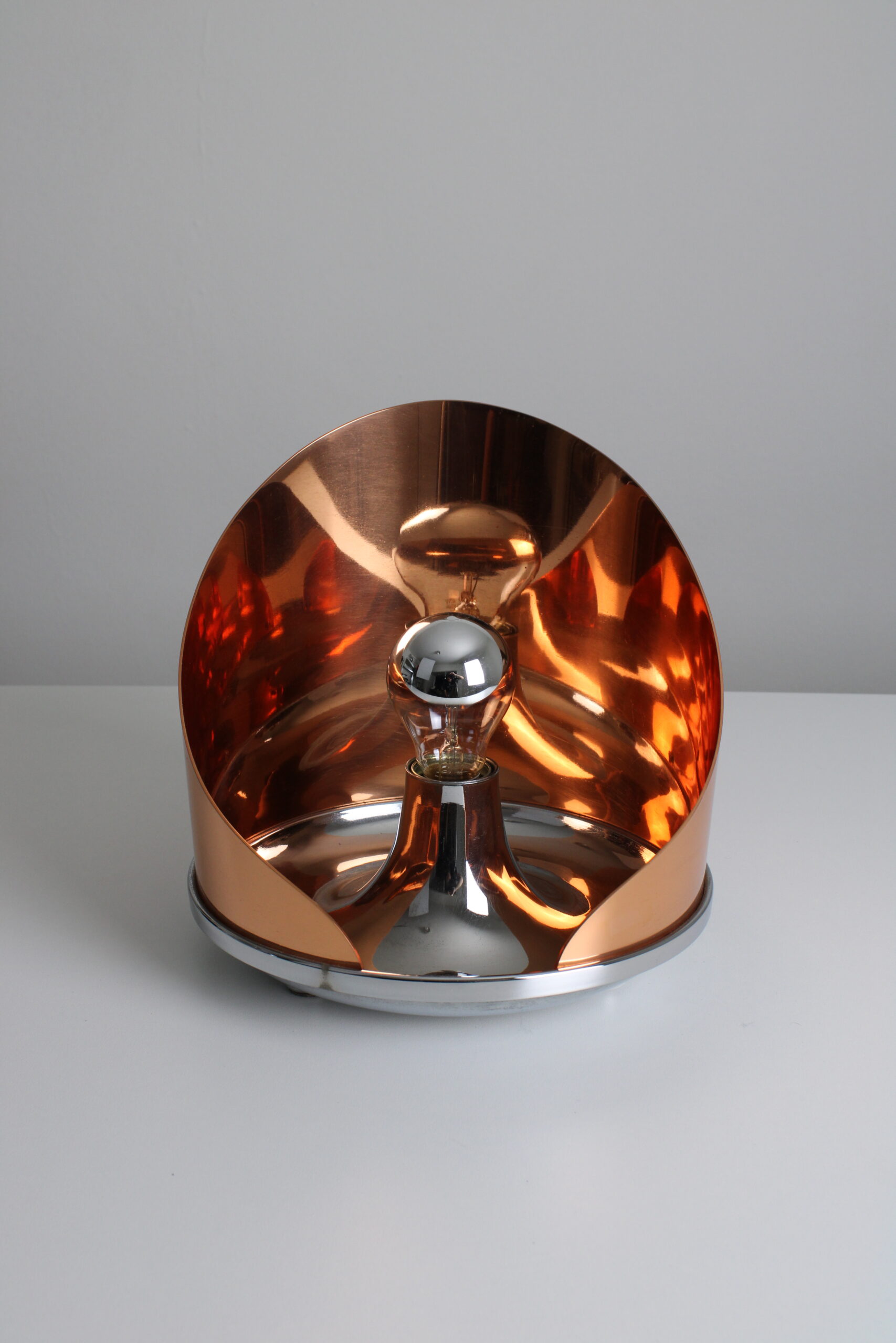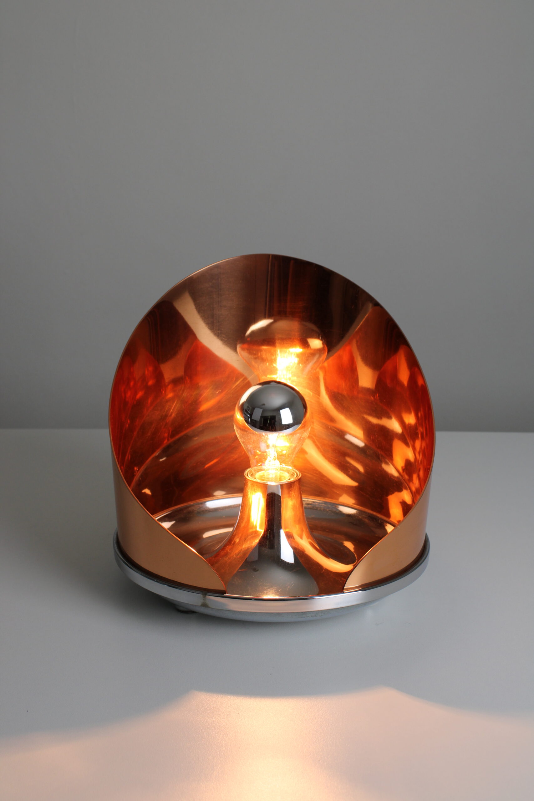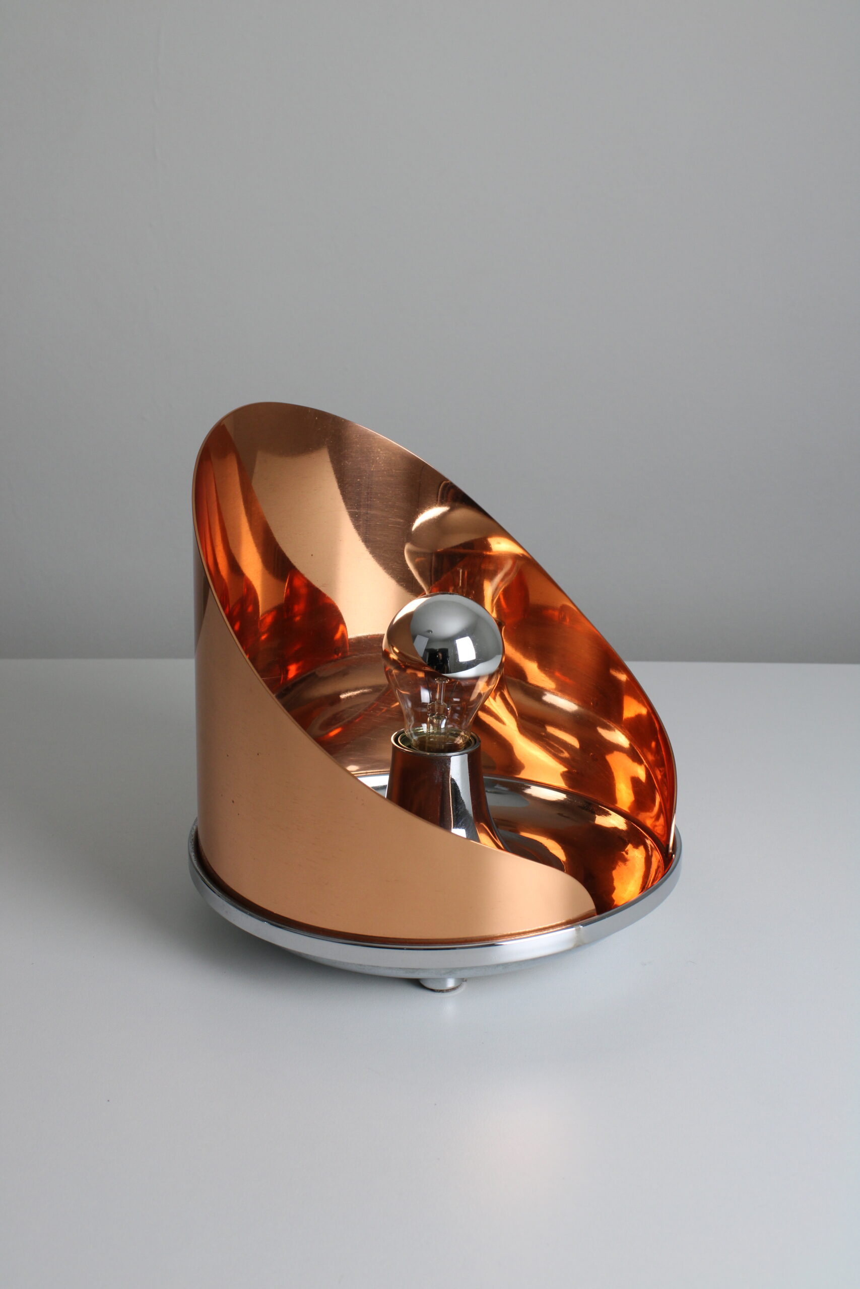A design featuring a round solid copper shade that creates a warm and diffused light. Fully made of high quality materials such as chrome plated brass. A unique lamp that grabs attention. In excellent condition.