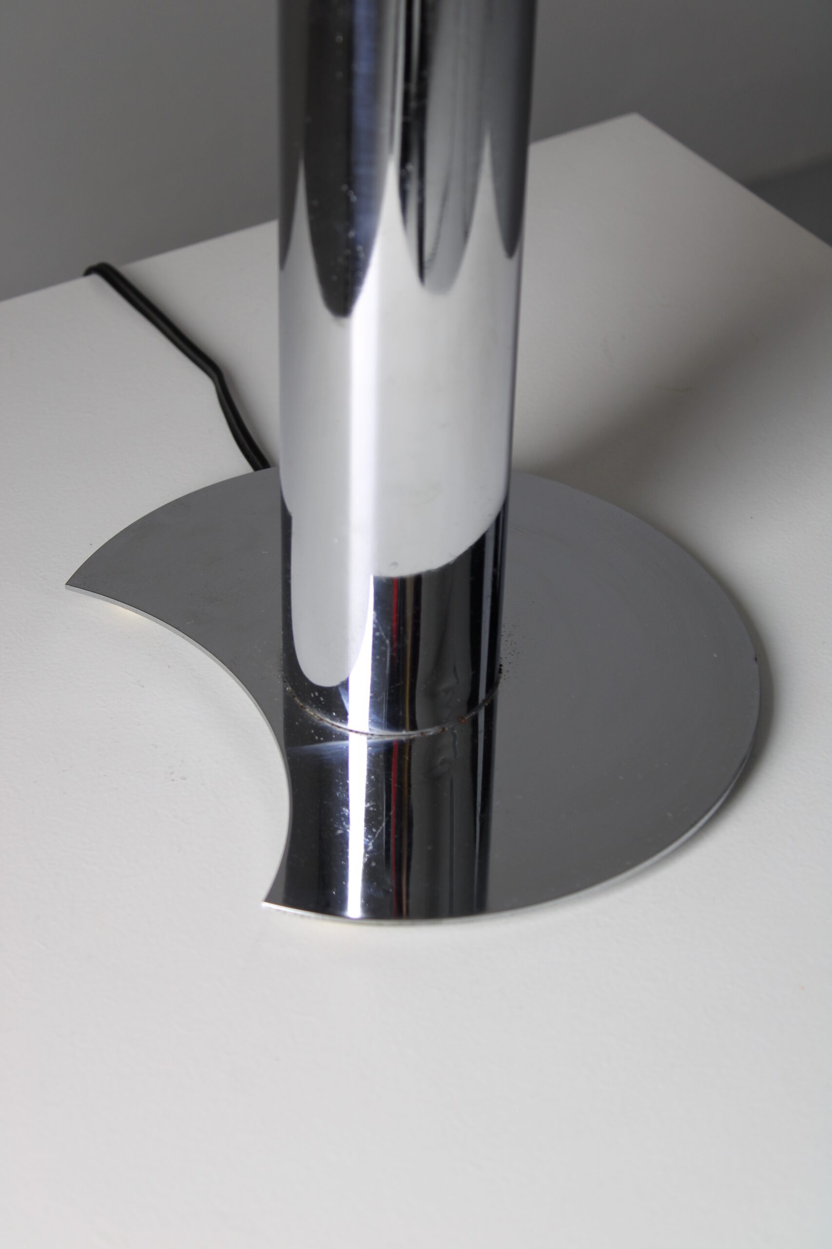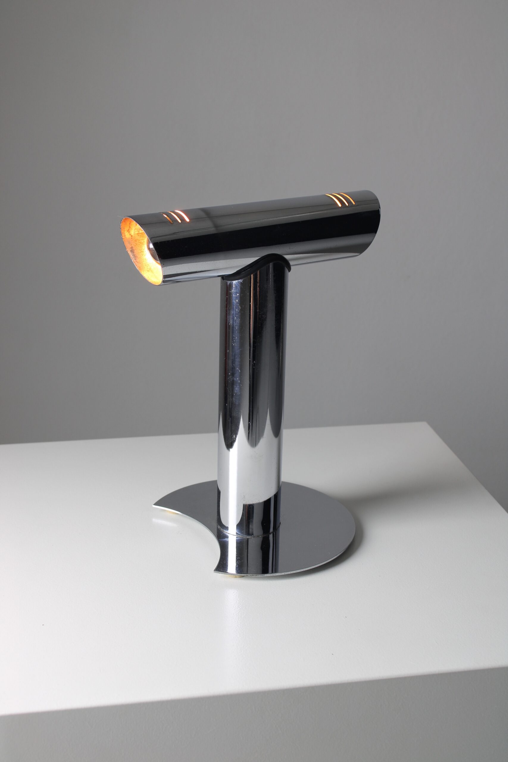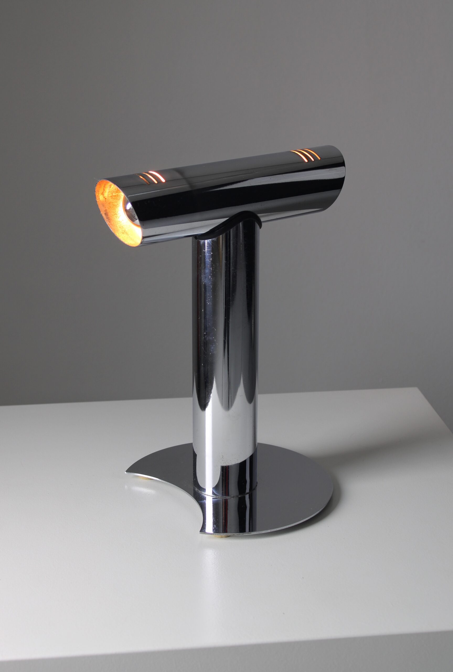 Zot table lamp, designed by Ennio Chiggio for Lumenform in 1971. This rare lamp was produced in three different sizes; we are offering the largest size. Described in the Lumenform catalog as ZOT/3 “a lighting equipment fully made of chrome-plated metal.” The overall condition is very good, with some minor wear to the chrome.