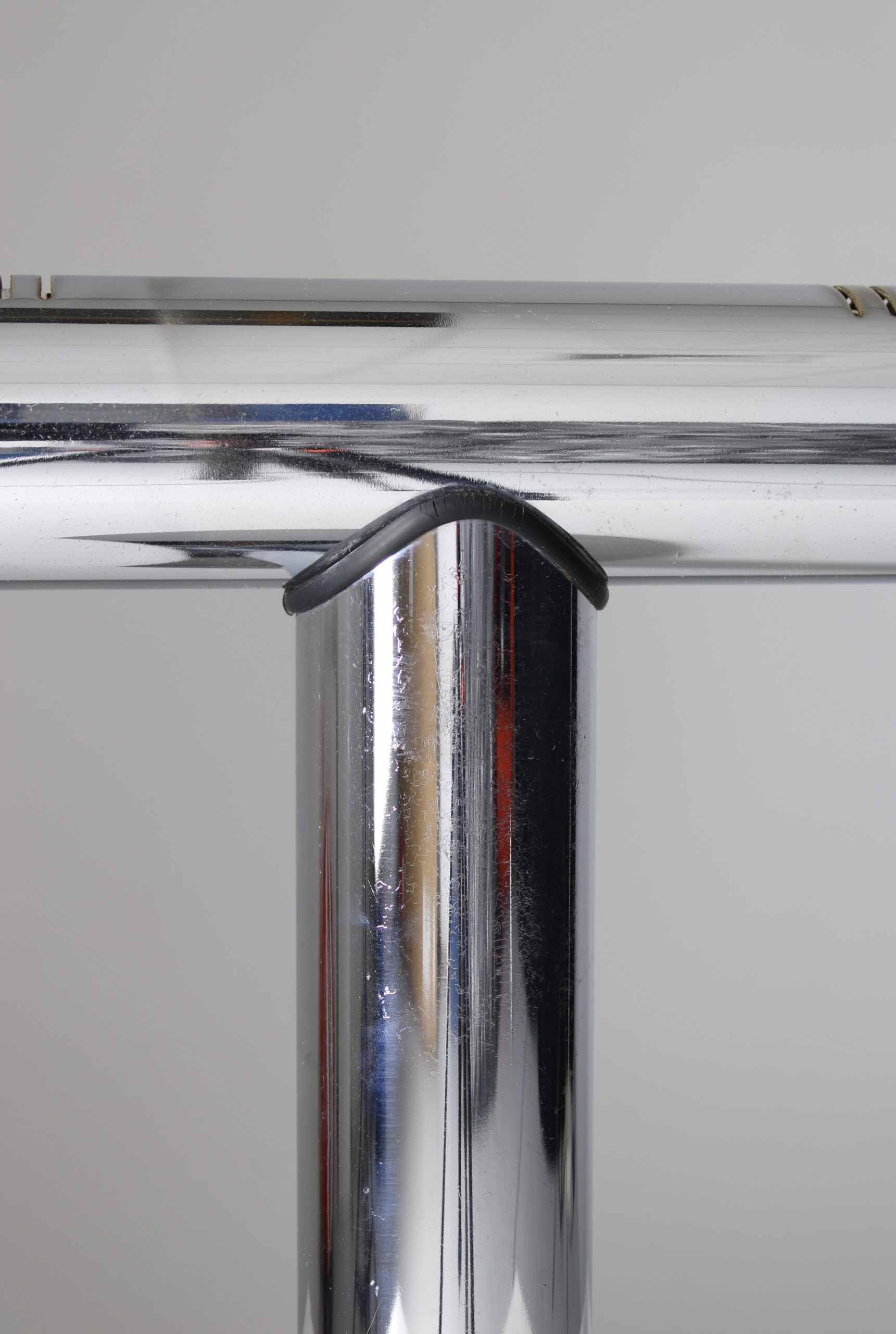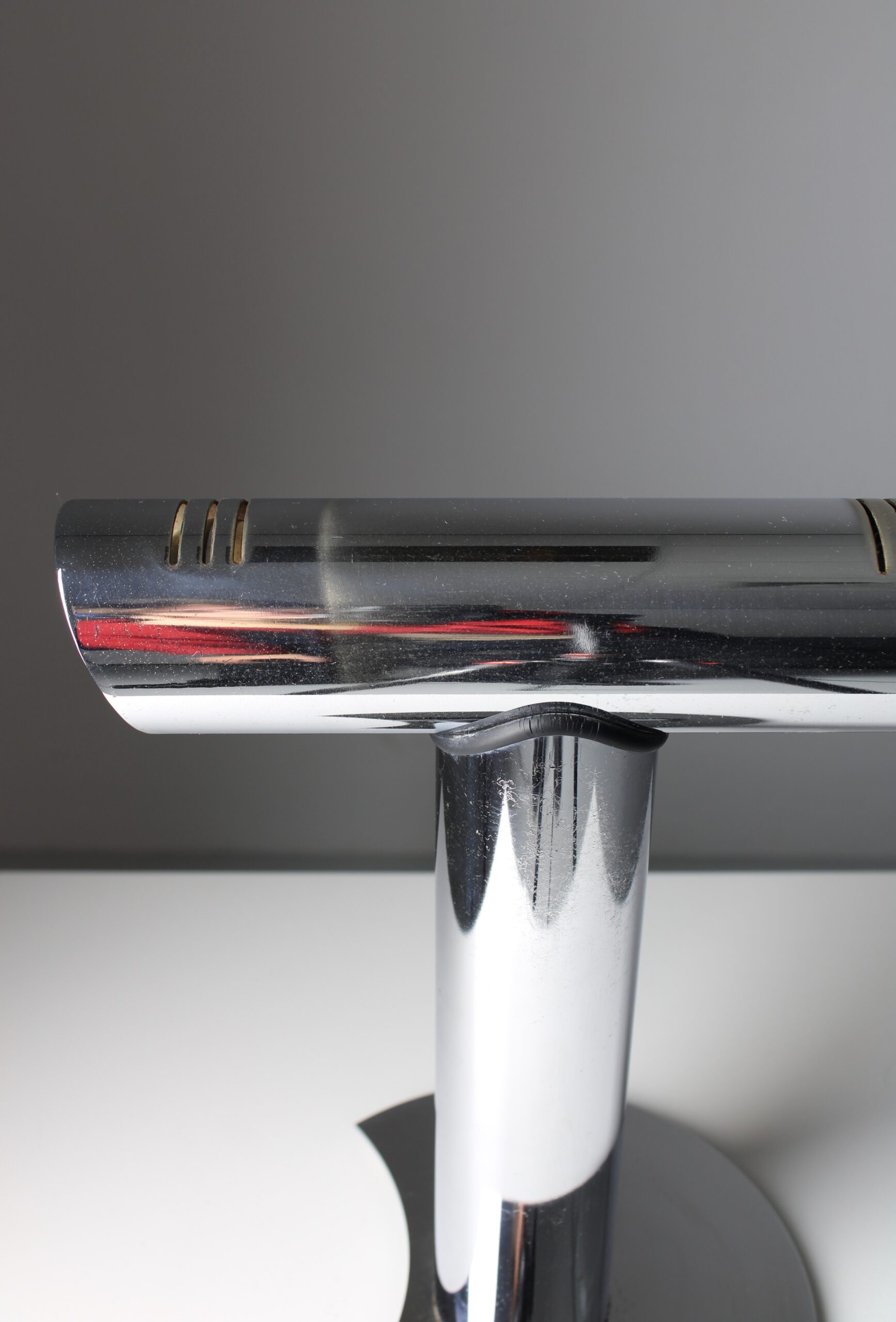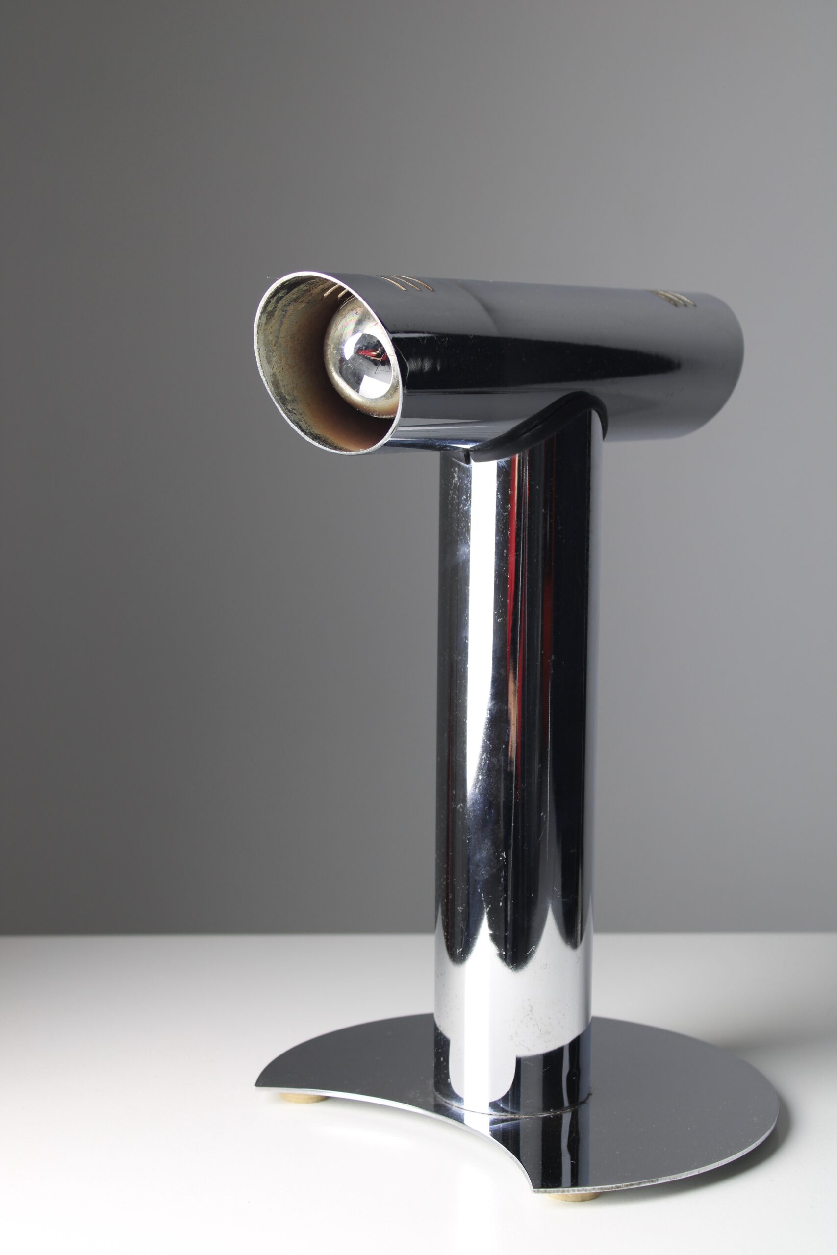 Zot table lamp, designed by Ennio Chiggio for Lumenform in 1971. This rare lamp was produced in three different sizes; we are offering the largest size. Described in the Lumenform catalog as ZOT/3 “a lighting equipment fully made of chrome-plated metal.” The overall condition is very good, with some minor wear to the chrome.